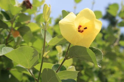 海滨木槿(学名:Hibiscus hamabo Sieb. et Zucc.)是锦葵科木槿属植物,落叶小乔木,株高3-5米,胸径20厘米,扁球形树冠,枝叶繁盛。厚纸质单叶互生,扁圆形、倒卵形或宽倒卵形,先端钝近平,具短突尖,基部圆形或浅心形,叶缘中上部具细圆齿,叶面绿色光滑、具星状毛。花两性,单生于近枝端叶腋,花梗长0.5-1厘米,小苞片数8-10,花萼长2厘米,花冠直径5.8厘米。三角状卵形蒴果,长2厘米;褐色种子呈肾形,长0.5厘米,具腺状乳突。