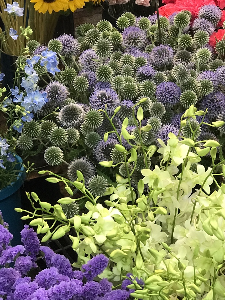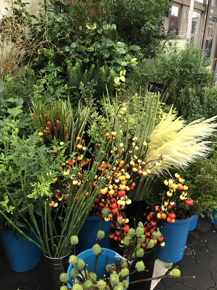 说到花,黑门市场看了两间店,一间是鲜花,一间是盆栽。切花的品种与大陆差异大,很多材料不同,比如酸浆,木贼,松树,香蒲,蒲苇等,有点另类,但材料真的鲜,壮,贵。