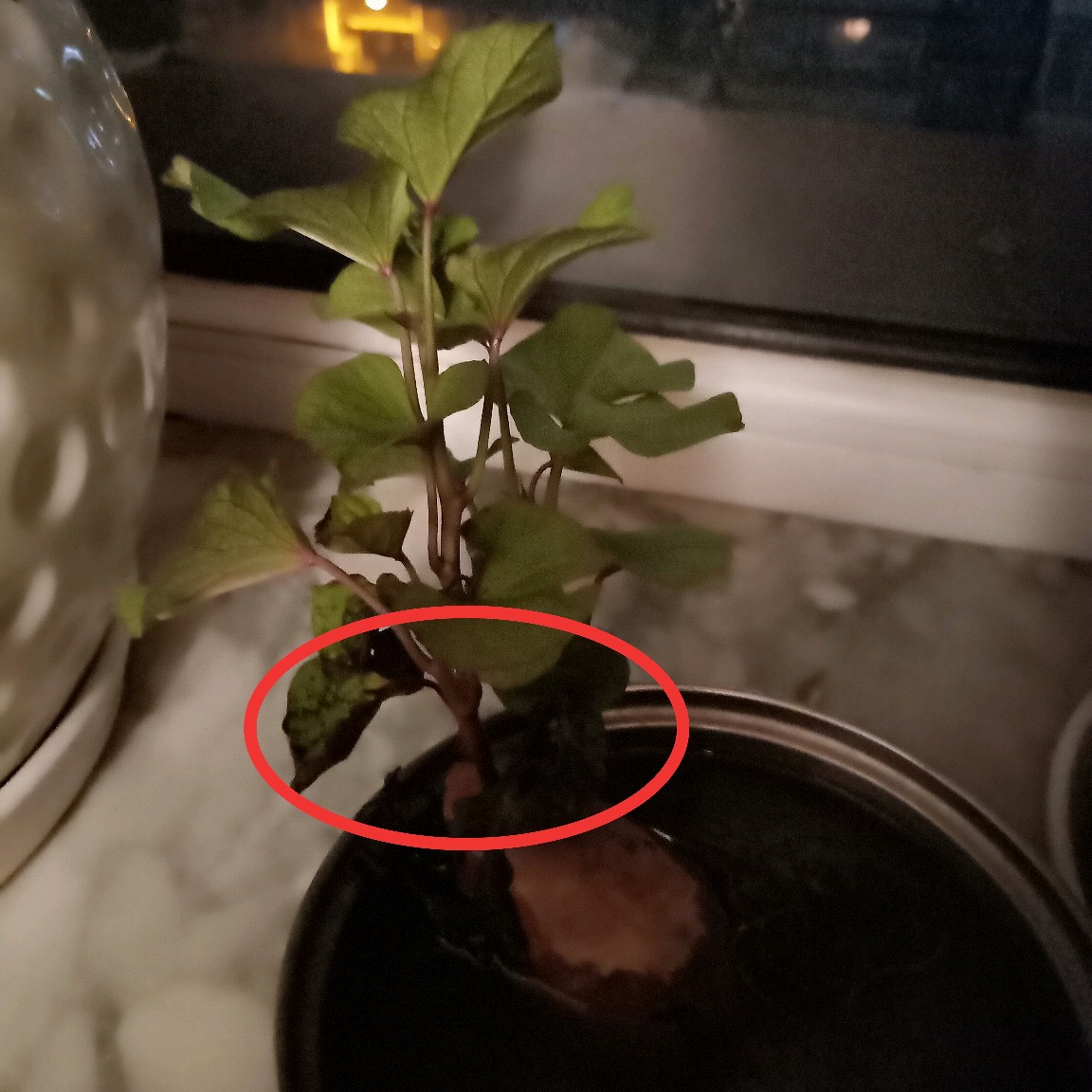 我种的这个红薯是用水泡的,现在已经长很大了,可是我发现了一个问题,下面的叶子全蔫儿了,请问这是怎么回事?