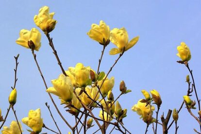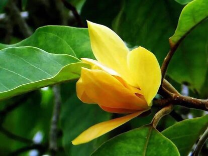 黄兰(Michelia champaca Linn.):常绿乔木,高达10余米;枝斜上展,呈狭伞形树冠;芽、嫩枝、嫩叶和叶柄均被淡黄色的平伏柔毛。叶薄革质,披针状卵形或披针状长椭圆形,下面稍被微柔毛。花黄色,极香,花被片15-20片,倒披针形,长3-4厘米,宽4-5毫米;蓇葖倒卵状长圆形,长1-1.5厘米,有疣状凸起;种子2-4枚,有皱纹。花期6-7月,果期9-10月。