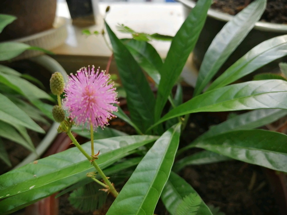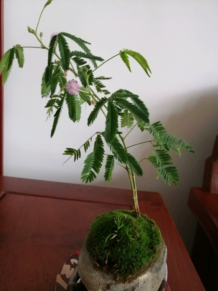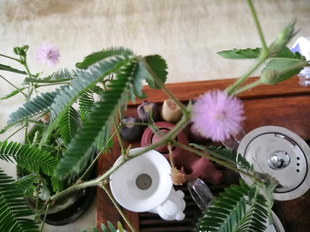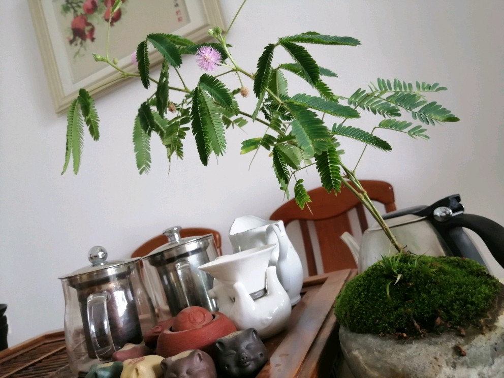 含羞草畏寒,冬季在阳台外会冻死,今起移至茶室。有了绿色,简陋的茶室顿时熠熠生辉。