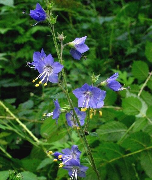 花荵是一种花荵科 、花荵属植物,多年生草本,根匍匐,圆柱状,多纤维状须根。茎直立,高0.5-1米,无毛或被疏柔毛。羽状复叶互生,茎下部叶长可达20多厘米,茎上部叶长7-14厘米,小叶互生,11-21片,长卵形至披针形,顶端锐尖或渐尖,基部近圆形,全缘,两面有疏柔毛或近无毛,无小叶柄;叶柄生下部者长,上部具短叶柄或无柄,与叶轴同被疏柔毛或近无毛。聚伞圆锥花序顶生或上部叶腋生,疏生多花;花梗连同总梗密生短的或疏长腺毛;花萼钟状,被短的或疏长腺毛,裂片长卵形、长圆形或卵状披针形,顶端锐尖或钝头,稀钝圆,与萼筒近相等长;花冠紫蓝色,钟状,裂片倒卵形,顶端圆或偶有渐狭或略尖,边缘有疏或密的缘毛或无缘毛;雄蕊着生于花冠筒基部之上,通常与花冠近等长,花药卵圆形,花丝基部簇生黄白色柔毛;子房球形,柱头稍伸出花冠之外。蒴果卵形。种子褐色,纺锤形,种皮具有膨胀性的粘液细胞,干后膜质似种子有翅。