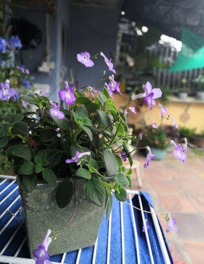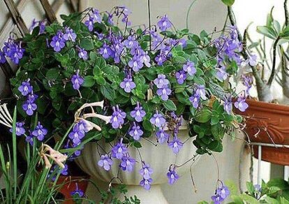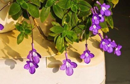 海豚花有着优雅的外形,其叶子肉质,圆形或长椭圆形,叶色浅绿,也有斑叶品种,叶对生或轮生;花茎从叶腋长出,花瓣5枚,基部愈合成筒状,花色多为蓝色,也有白花的品种,花朵向四方伸展。