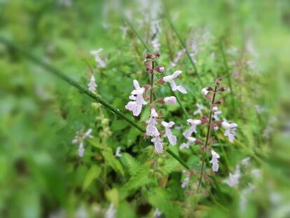 地蚕多年生草本,高40-50厘米;根茎横走,肉质,肥大,在节上生出纤维状须根。茎直立,四稜形,具四槽,在稜及节上疏被倒向疏柔毛状刚毛。茎叶长圆状卵圆形、长4.5-8厘米,宽2.5-3厘米,先端钝,基部浅心形或圆形,边缘有整齐的粗大圆齿状锯齿,上面绿色,散布疏柔毛状刚毛,下面较淡,主沿脉上密被余部疏被疏柔毛状刚毛,侧脉约4对,上面不明显,下面显著,叶柄长1-4.5厘米,密被疏柔毛状刚毛,腹平背凸;苞叶变小,最下一对苞叶与茎叶同形,较小,披针状卵圆形,先端钝,基部圆形,具短柄或近于无柄,上部苞叶微小,菱状披针形,通常比萼短,边缘波齿状,无柄。