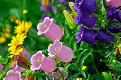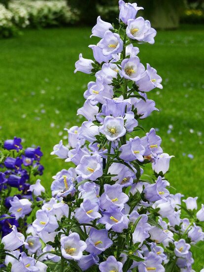 风铃草(学名:Campanula medium L.)是桔梗科、风铃草属二年生宿根草本植物,株高50-120厘米;茎粗壮直立,基生。叶簇生,卵形至倒卵形;小花1-2朵聚生成总状花序,花冠钟形,长约6厘米,有白、蓝或紫等色;蒴果,带有宿存的花萼裂片;种子多数,椭圆状,平滑。花期5-6月。