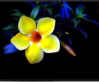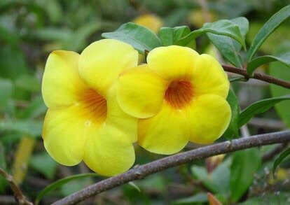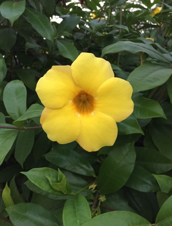 软枝黄蝉(学名:Allemanda cathartica L.)是夹竹桃科、黄蝉属多年生藤状灌木,长可达4米;枝条软弯垂,叶片纸质,端部短尖,基部楔形,叶脉两面扁平,叶柄扁平,聚伞花序顶生;花萼裂片披针形,花冠橙黄色,大形,花冠下部长圆筒状,基部不膨大,蒴果球形,种子扁平,边缘膜质或具翅。春夏两季开花,冬季结果。