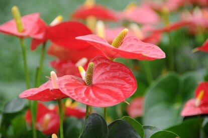 花烛(Anthurium andraeanum Linden):是单子叶植物纲天南星科花烛属多年生常绿草本植物。茎节短;叶自基部生出,绿色,革质,全缘,长圆状心形或卵心形。叶柄细长,佛焰苞平出,革质并有蜡质光泽,橙红色或猩红色;肉穗花序黄色,可常年开花不断。