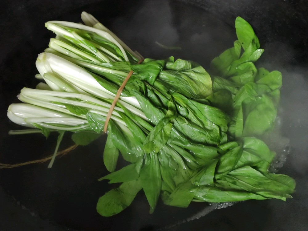 接着烧水,不用烧开,锅底开始冒泡就可以下锅倒青了