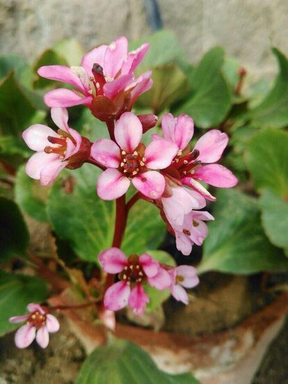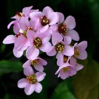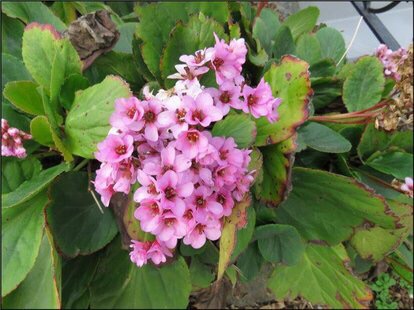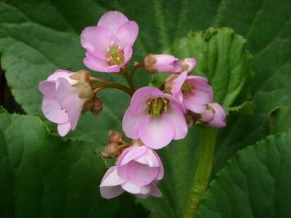 岩白菜〔学名:Bergenia purpurascens (Hook. f. et Thoms.) Engl.〕是虎耳草科,岩白菜属多年生草本植物,高可达52厘米。根状茎粗壮,叶均基生;叶片革质,先端钝圆,边缘具波状齿至近全缘,基部楔形,两面具小腺窝,托叶鞘边缘无毛。聚伞花序圆锥状,花葶疏生腺毛。萼片革质,近狭卵形,花瓣紫红色,阔卵形,子房卵球形,5-10月开花结果。