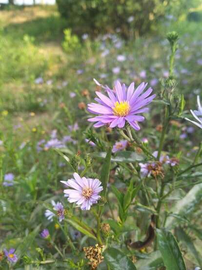 钻叶紫菀(学名:Aster subulatus Michx.)是菊科,紫菀属一年生草本植物,高可达150)厘米。主根圆柱状,向下渐狭,茎单一,直立,茎和分枝具粗棱,光滑无毛,基生叶在花期凋落;茎生叶多数,叶片披针状线形,极稀狭披针形,两面绿色,光滑无毛,中脉在背面凸起,侧脉数对,头状花序极多数,花序梗纤细、光滑,总苞钟形,总苞片外层披针状线形,内层线形,边缘膜质,光滑无毛。雌花花冠舌状,舌片淡红色、红色、紫红色或紫色,线形,两性花花冠管状,冠管细,瘦果线状长圆形,稍扁,6-10月开花结果。