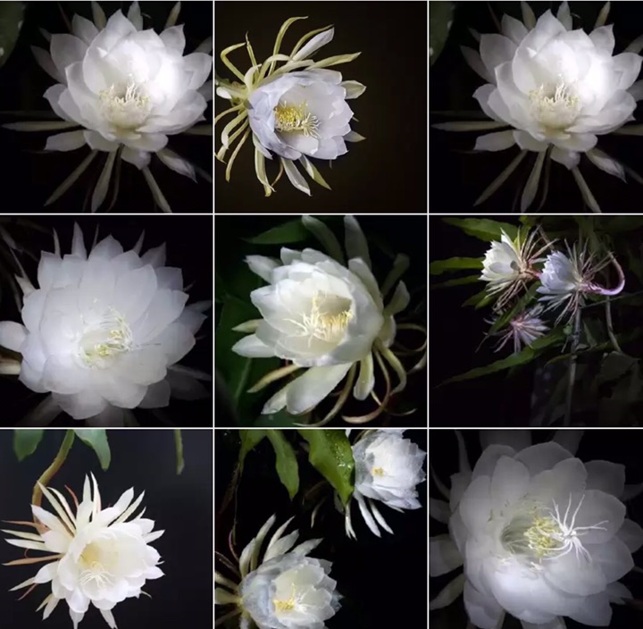 昙花(学名:Epiphyllum oxypetalum (DC.)Haw ):附生肉质灌木,高2~6米,老茎圆柱状,木质化。分枝多数,叶状侧扁,披针形至长圆状披针形,边缘波状或具深圆齿,基部急尖、短渐尖或渐狭成柄状,深绿色,无毛,中肋粗大,老株分枝产生气根。花单生于枝侧的小窠,漏斗状,于夜间开放,芳香,长25~30厘米,直径10~12厘米;花托绿色,略具角,被三角形短鳞片;瓣状花被片白色,倒卵状披针形至倒卵形,长7-10厘米,宽3~4.5厘米,边缘全缘或啮蚀状。浆果长球形,具纵棱脊,无毛,紫红色。种子多数,卵状肾形,亮黑色,具皱纹,无毛