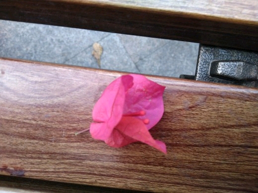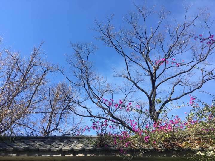叶子花(学名:Bougainvillea spectabilis Willd.),紫茉莉科,叶子花属木质藤本状灌木,茎有弯刺,并密生绒毛。单叶互生,卵形全缘,被厚绒毛,顶端圆钝。花很细小,黄绿色,三朵聚生于三片红苞中,外围的红苞片大而美丽,有鲜红色、橙黄色、紫红色、乳白色等,被误认为是花瓣,因其形状似叶,故称其为叶子花。花期可从11月起至第二年6月。冬春之际,姹紫嫣红的苞片展现,给人以奔放、热烈的感受,因此又得名贺春红。