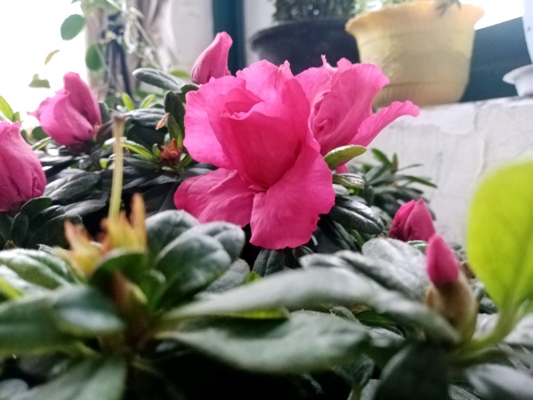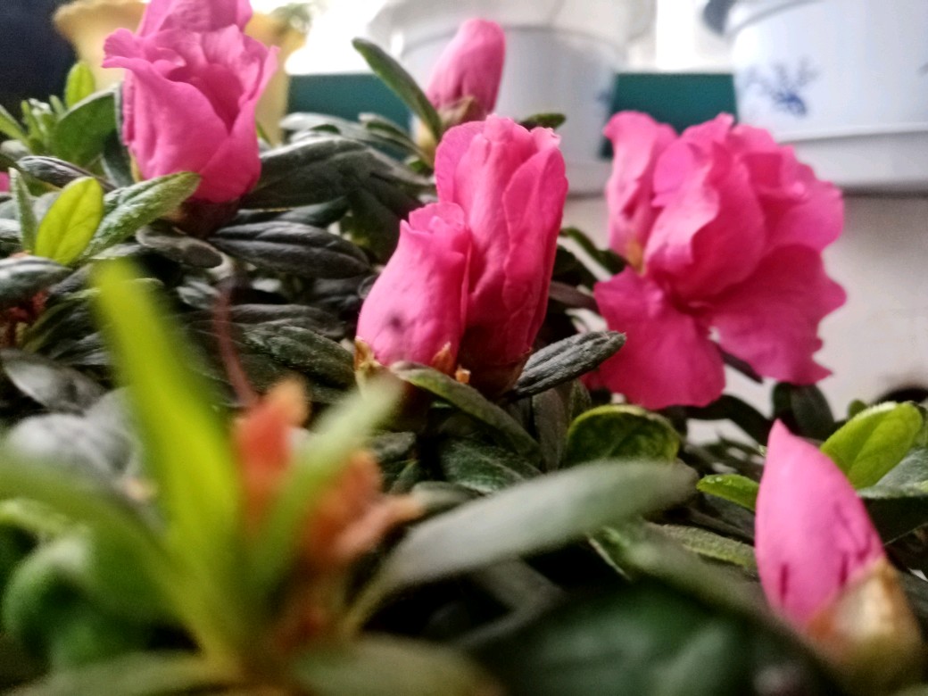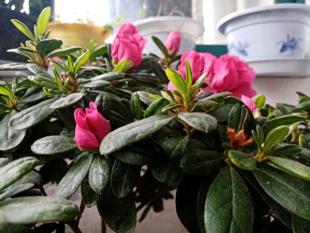 这棵杜鹃花是我自己养的,己经三、四年了。买回来的时候花没有很多,看起来没有精神。养了一段时间,开始打花苞了,我心里很高兴。
