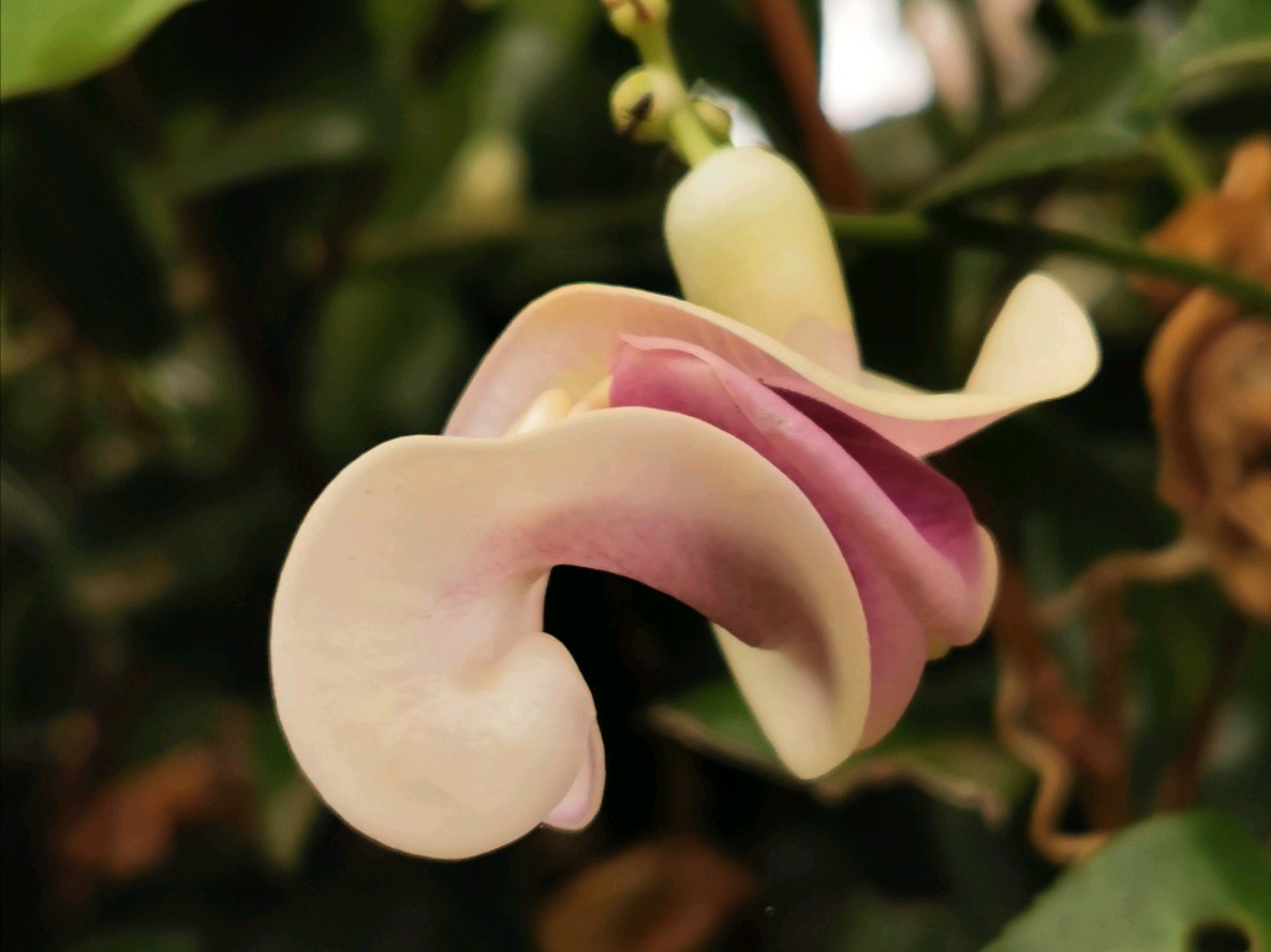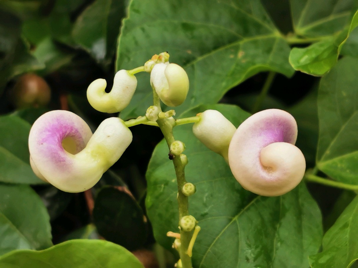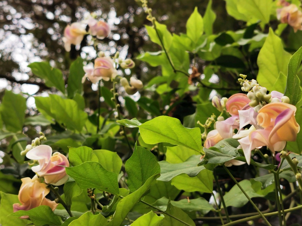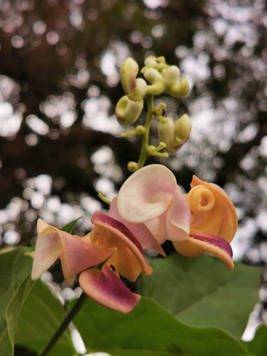 这次新遇见一豆,花形奇趣,花色丰富,见了不由自主的有种神随之转、腰随之扭的感觉,兴奋莫名,豆科奇葩多
