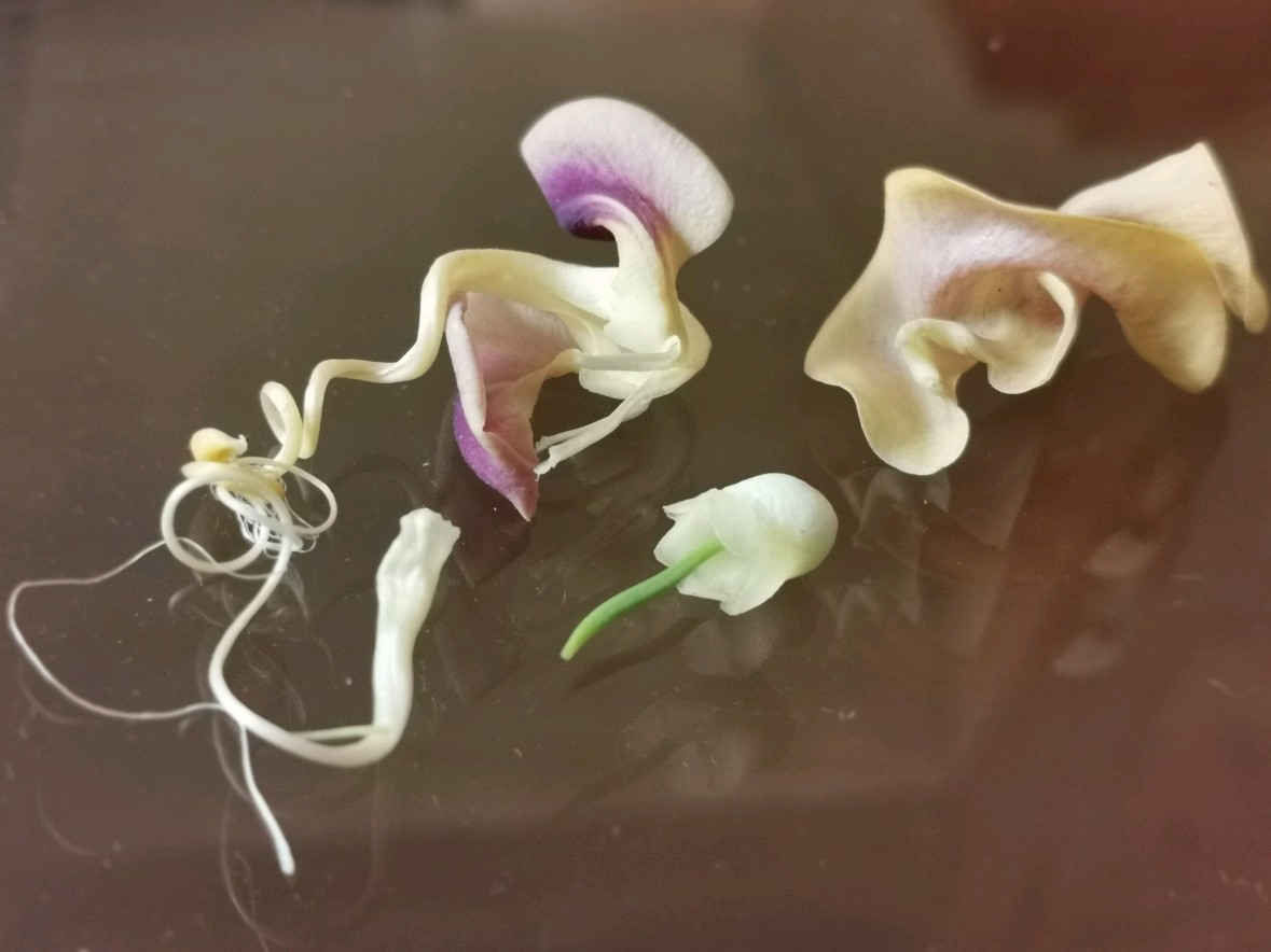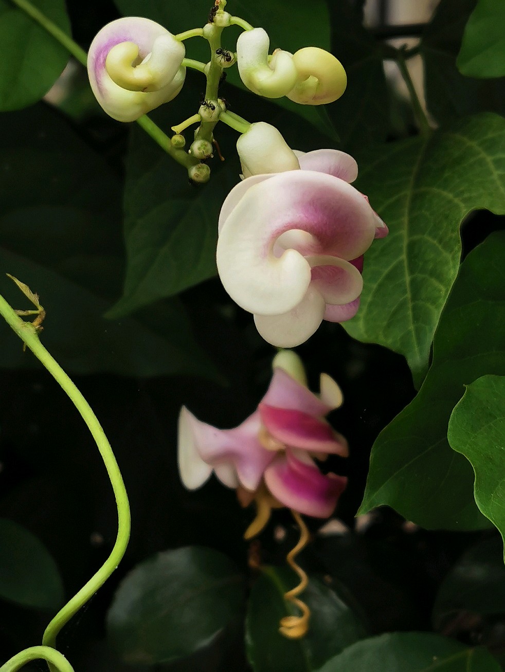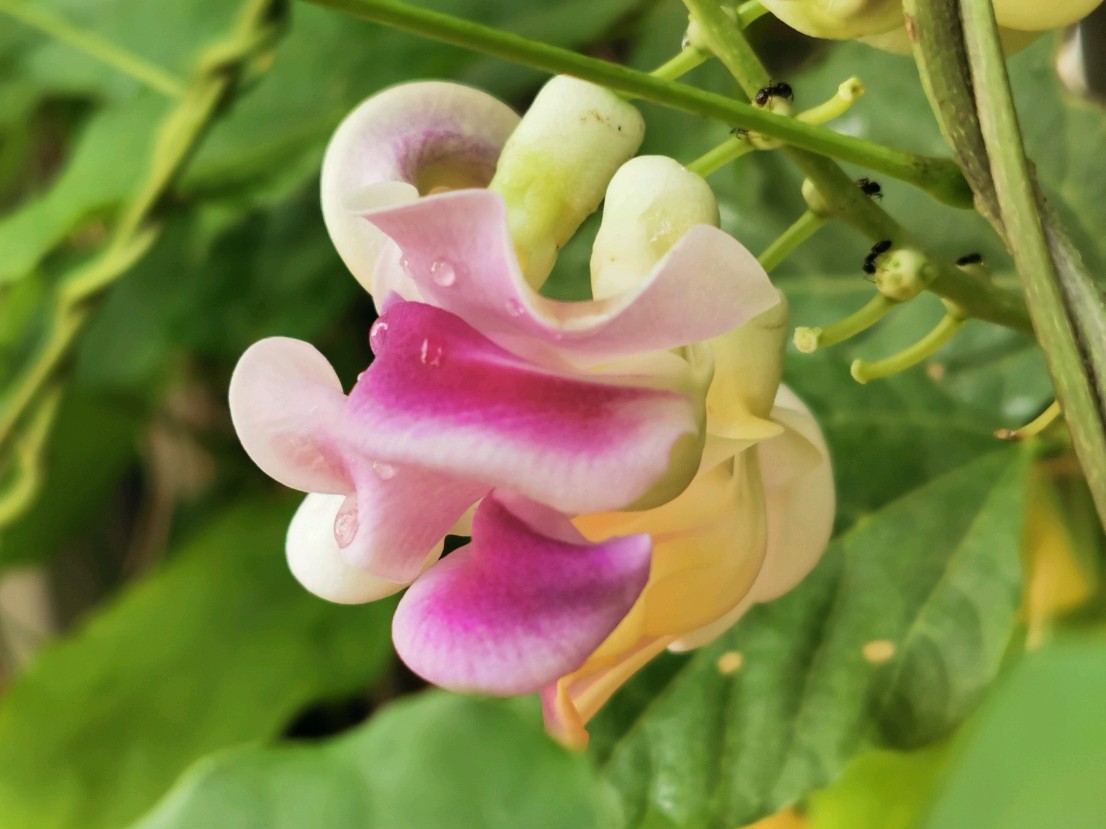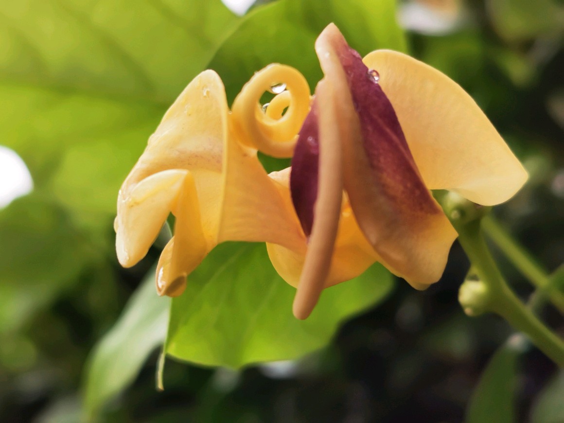 这次新遇见一豆,花形奇趣,花色丰富,见了不由自主的有种神随之转、腰随之扭的感觉,兴奋莫名,豆科奇葩多