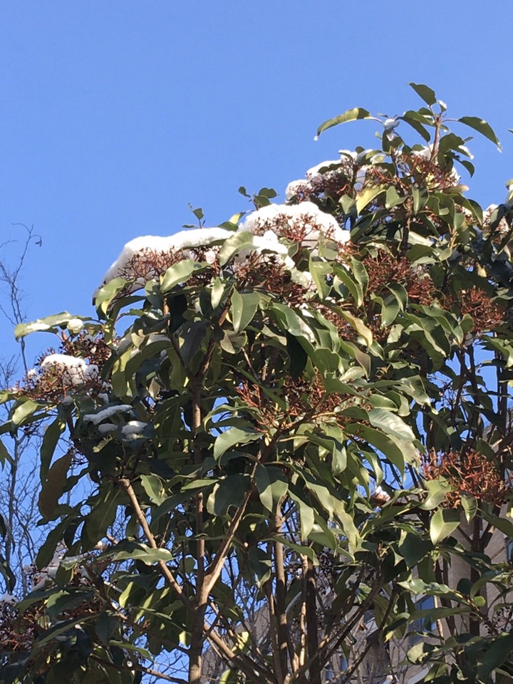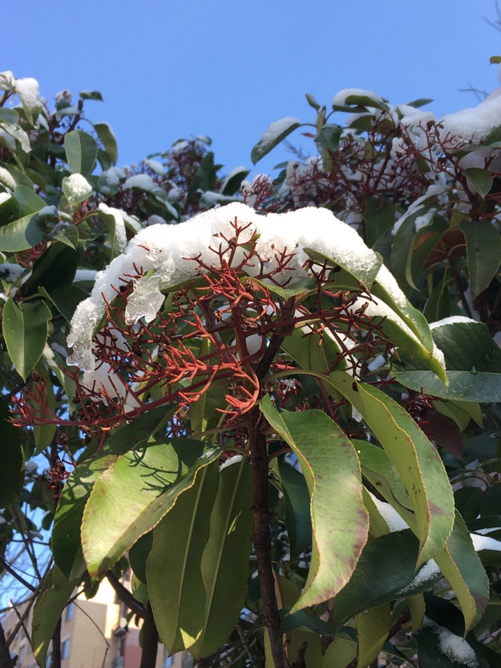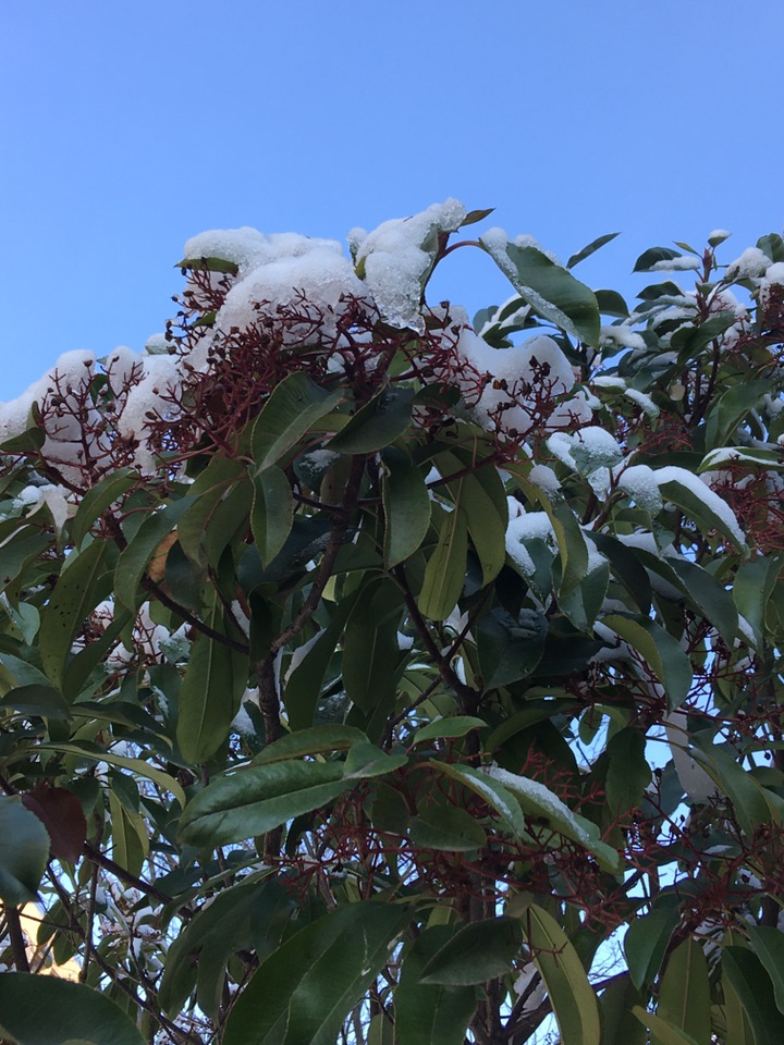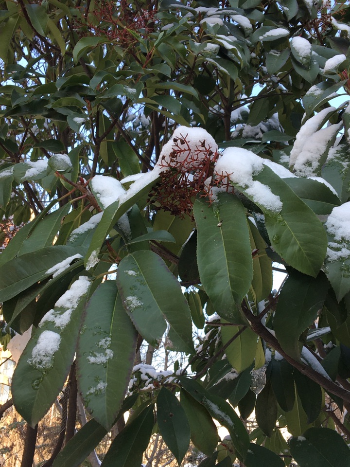 昨天下了一整天的雪,世界变得银装素裹。今天一早,阳光灿烂,天朗气清。雪渐渐融化,中午时分,石楠露出了大部分枝叶,只戴着一顶顶雪冠,此时叶更翠绿,花枝更艳丽。