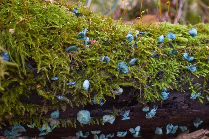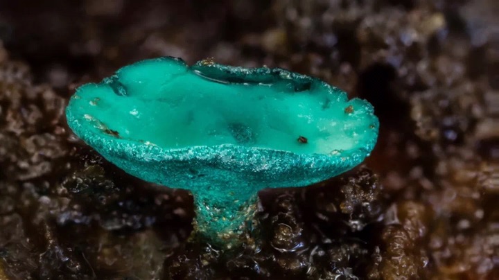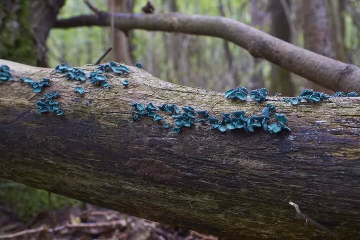 在森林潮湿的枯枝败叶中生长着很多真菌,而且有的生得极其绚丽。只不过,它们往往极易腐败,其绚丽通常是转瞬即逝。小孢绿杯菌(Chlorociboria aeruginascens,又称作小孢绿杯盘菌),就是这样一种真身通常不为人知晓,但却以独特的痕迹惊艳于世的真菌。