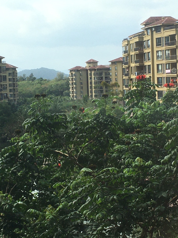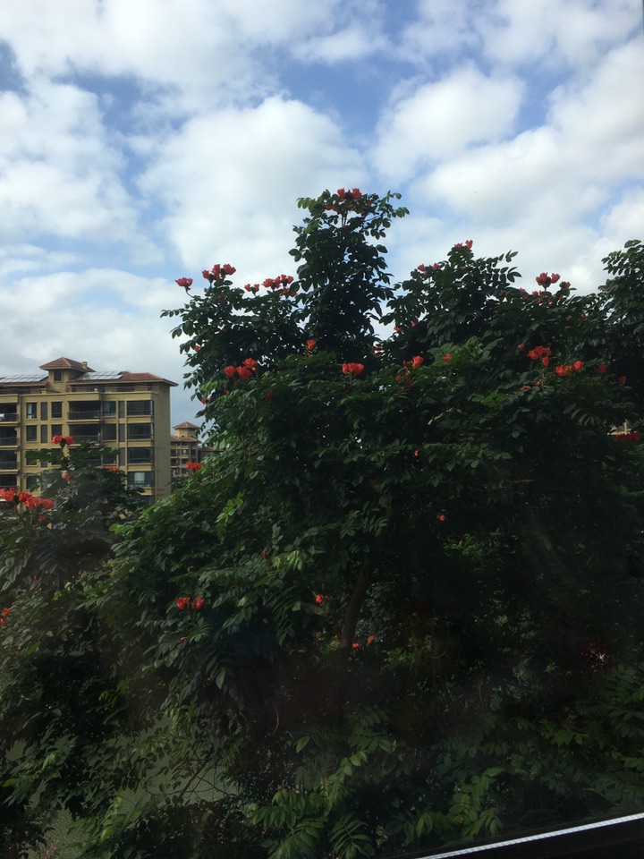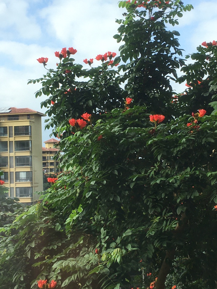 在这四季如夏的海南,这种花常开在冬季的一、二月份。花朵常绽在树冠最高处,形同皇冠的花朵开放时总给人一种女王莅临的错觉。绿叶层层叠叠,枝干拔地参天,在花开放的时节就好似有一朵朵烟火高悬天空。