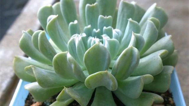 特玉莲,别名反叶石莲,景天科拟石莲属。叶子上面有白粉,为蓝色。叶子背面形成了一个爱心型,如果养护得当可以变成华丽的粉色。