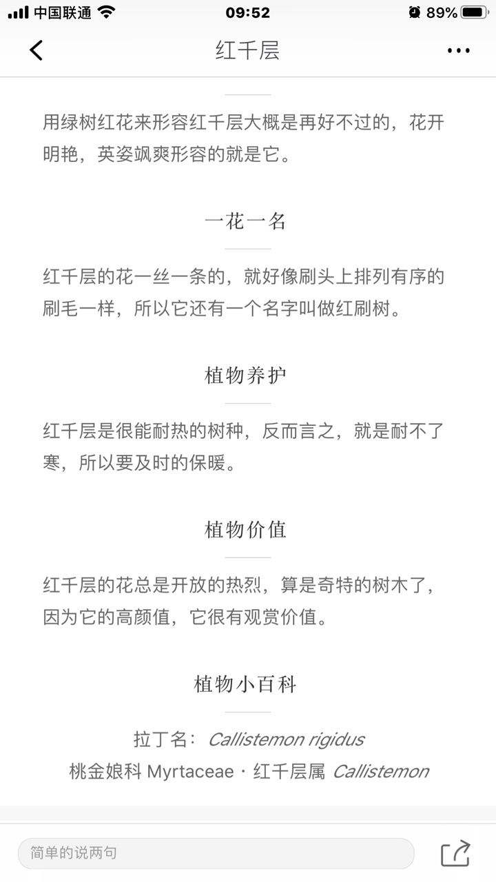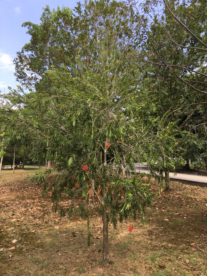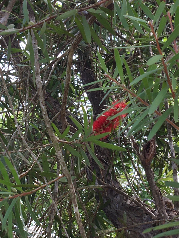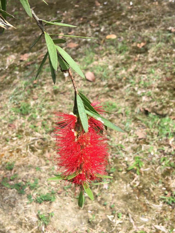 红千层枝叶如柳,毛茸茸的花串在枝头,想一把把红色的圆柱形的小毛刷,也像一把把小巧精致的鸡毛掸子。