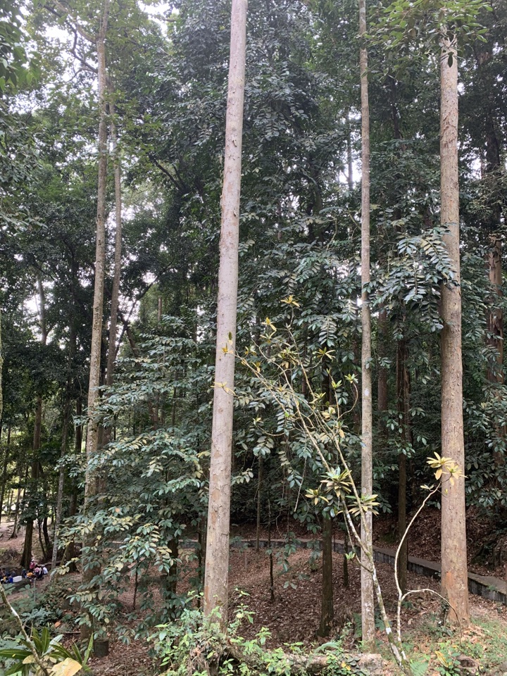 在马国的一个森林公园里看到了一片望天树。听到这名字,您一定会问这树得有多高啊!没错,它很高,站在树下的小溪边,我只能看到它笔直的树干,至于叶子长什么样,根本看不清。