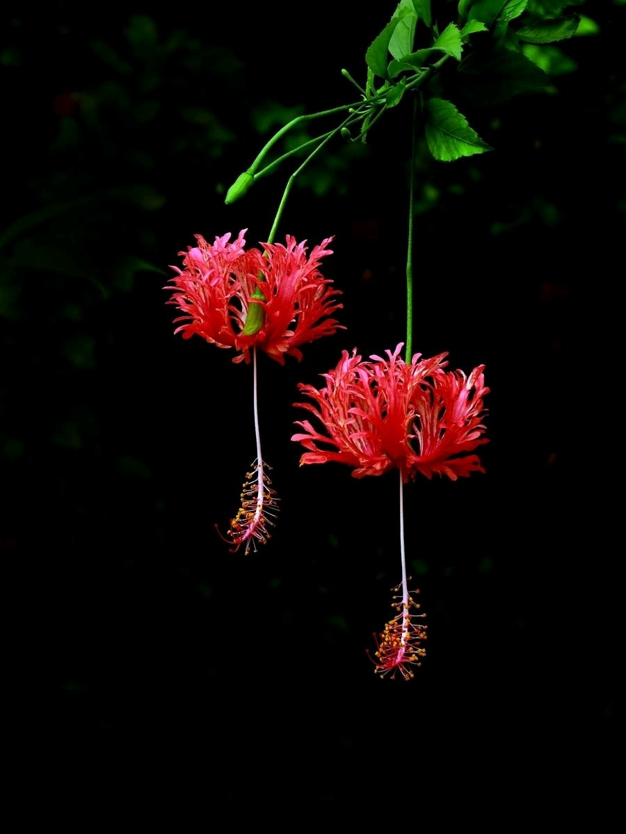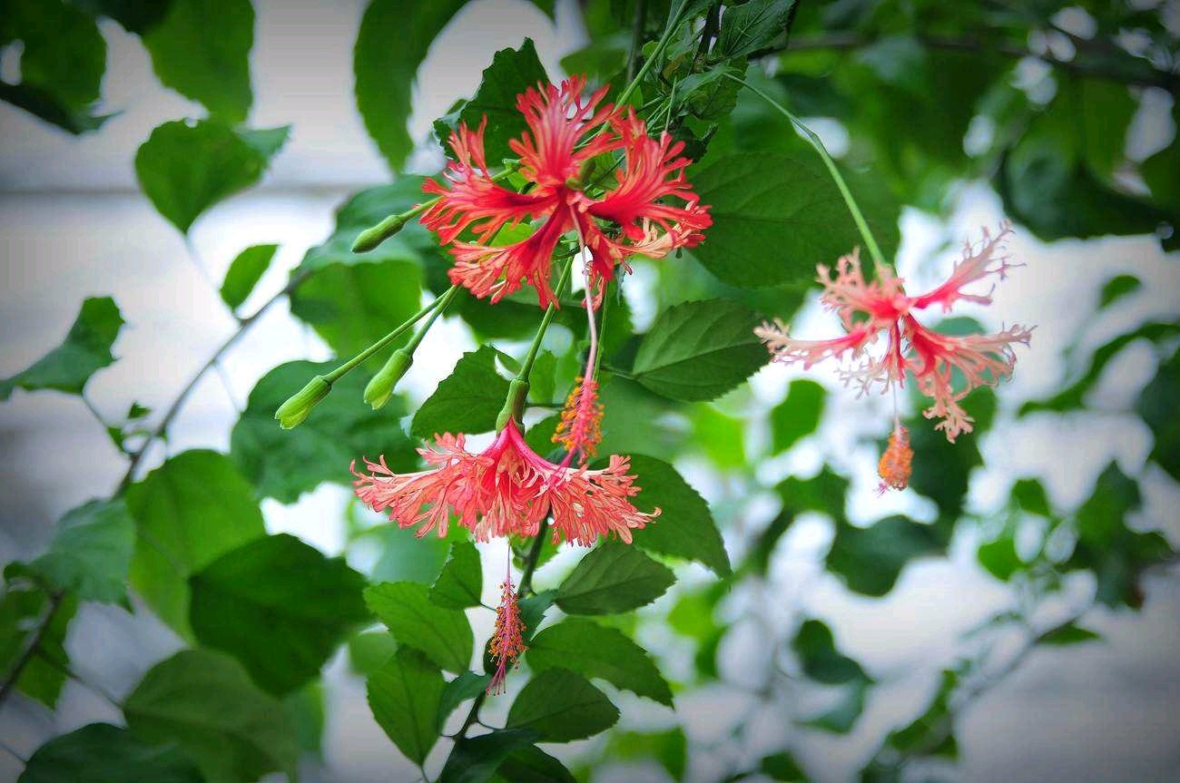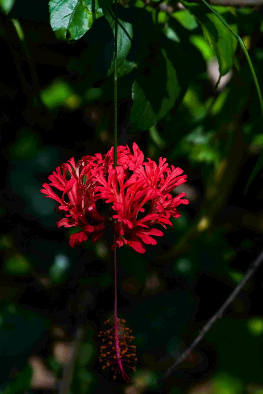 吊灯扶桑(学名:Hibiscus schizopetalus (Masters) Hook.f.):常绿直立灌木,高达3米;小枝细瘦,常下垂,平滑无毛。叶椭圆形或长圆形,边缘具齿缺,两面均无毛;托叶钻形,长约2毫米,常早落。花单生于枝端叶腋间;小苞片5,极小,披针形。花瓣5,红色,长约5厘米,深细裂作流苏状,向上反曲;雄蕊柱长而突出,下垂,长9-10厘米,无毛。蒴果长圆柱形,长约4厘米,直径约1厘米。花期全年。
