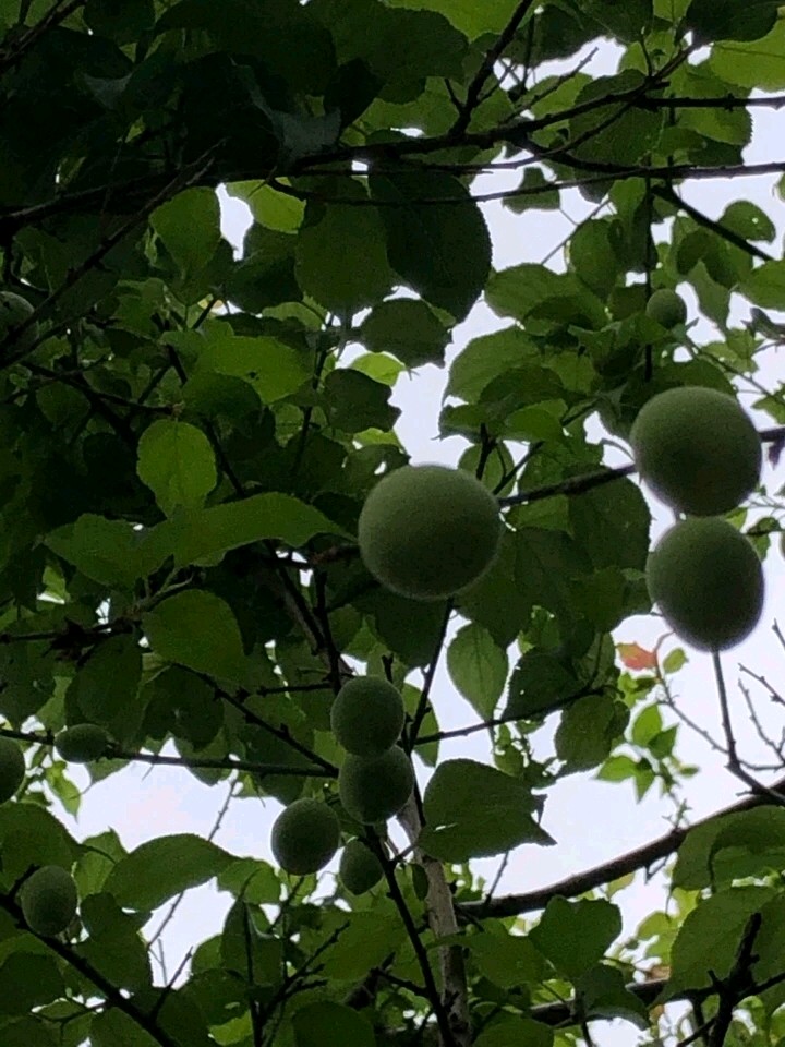 慢慢的,枝杈上长出了嫩绿的小叶子。上面又接出了绿油油的杏子。