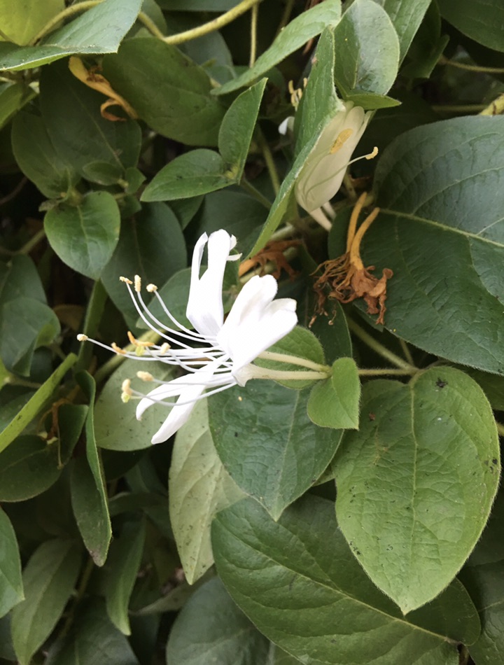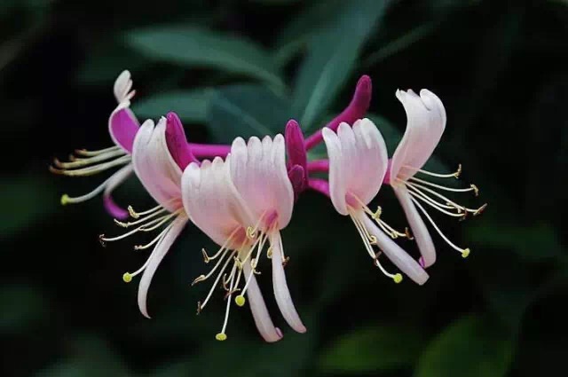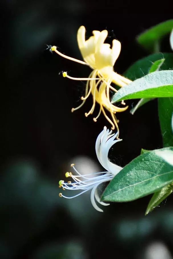 金银花,三月开花,五出,微香,蒂带红色,花初开则色白,经一、二日则色黄,故名金银花。又因为一蒂二花,两条花蕊探在外,成双成对,形影不离,状如雄雌相伴,又似鸳鸯对舞,故有鸳鸯藤之称。
