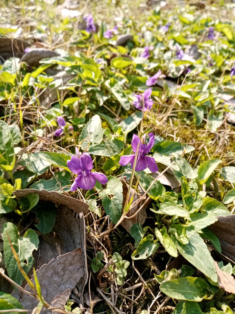 走到蓝球场的前面有一条小河。我想去旁边的小道上。看见小树丛下,一片片紫花地丁。淡雅的紫色很迷人。