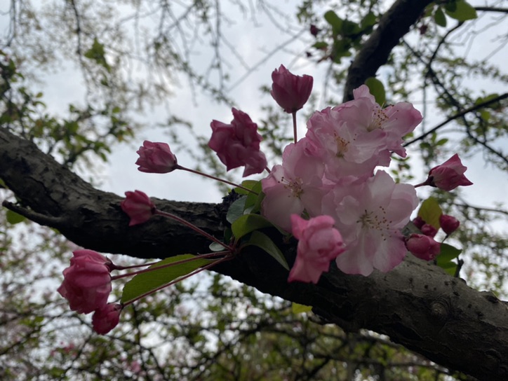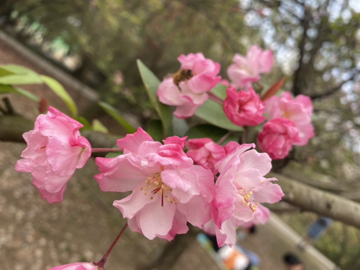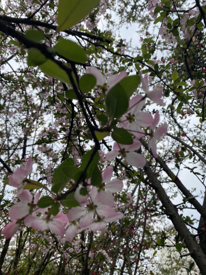 2,从花梗形态及颜色区分,西府海棠的花梗短粗, 多为绿色, 而垂丝海棠花梗长细, 多呈紫红色。