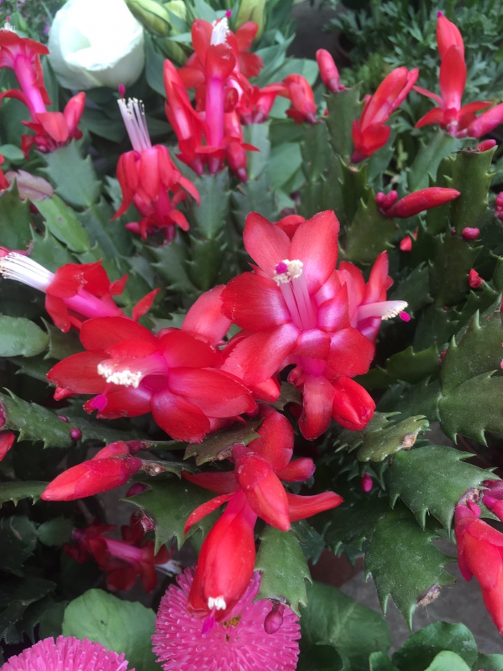 最近我们在周围还见到了不少花,比如最集中的一次就是在附近的花草市场,我们看到了艳红色的蟹爪兰、墨西哥龙舌兰科的千年木、带有一道闪电的郁金香,在马路市政绿化常见的羽扇豆等等植物。它们都开花了,温室里的环境就是好。
