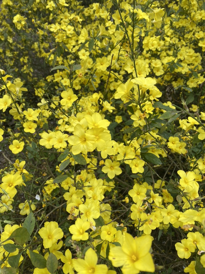 迎春花(学名:Jasminum nudiflorum Lindl. ):别名迎春、黄素馨、金腰带,落叶灌木丛生。株高30-500厘米。小枝细长直立或拱形下垂,呈纷披状。3小叶复叶交互对生,叶卵形至矩圆形。花单生在去年生的枝条上,先于叶开放,有清香,金黄色,外染红晕,花期2-4月。因其在百花之中开花最早,花后即迎来百花齐放的春天而得名。迎春花与梅花、水仙和山茶花统称为“雪中四友”,是中国常见的花卉之一。迎春花不仅花色端庄秀丽,气质非凡,具有不畏寒威,不择风土,适应性强的特点,历来为人们所喜爱。迎春花栽培历史1000余年,唐代白居易诗《代迎春花召刘郎中》以及宋代韩琦《中书东厅迎春》和明代周文华撰《汝南圃史》均有记载,迎春花现在为河南省鹤壁市的市花。