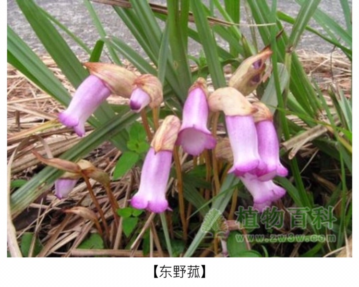 东野菰的形态:一年生寄生草本,高约15厘米,体内无叶绿素。总状花序,花轴甚短,由鳞状苞腋抽生花梗,顶端开花,单生侧向;小苞片缺如;萼片成鞘状,长2~3厘米,包围于花冠筒下部,先端尖;花冠筒长而内曲,淡紫红色,长3~5厘米,先端5裂外展;雄蕊4,2强,着生在花管筒下部,与裂片互生。背有1退化假雄蕊;雌蕊1,子房上位,1室,侧膜胎座,柱头大,呈皿状。蒴果卵球形,长1~1.5厘米,种子多数。花期9~10月。