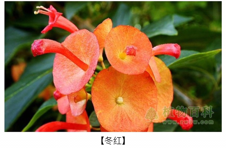 冬红的形态:常绿灌木,高3-7米;小枝四棱形,具四槽,被毛。叶对生,膜质,卵形或宽卵形,基部圆形或近平截,叶缘有锯齿,两面均有稀疏毛及腺点,但沿叶脉具毛较密;叶柄长1-2厘米,具毛及腺点,有沟槽。聚伞花序常2-6个再组成圆锥状,每聚伞花序有3花,中间的一朵花柄较两侧为长,花柄及花序梗具短腺毛及长单毛;花萼朱红色或橙红色,由基部向上扩张成一阔倒圆锥形的碟,直径可达2厘米,边缘有稀疏睫毛,网状脉明显;花冠殊红色,花冠管长2-2.5厘米,有腺点;雄蕊4,花丝长2.5-3厘米,具腺点。果实倒卵形,长约6毫米,4深裂,包藏于宿存、扩大的花萼内。花期冬末春初。
