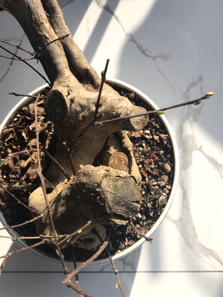 紫薇老桩19年底淘来的,光杆子上面帽新绿啦