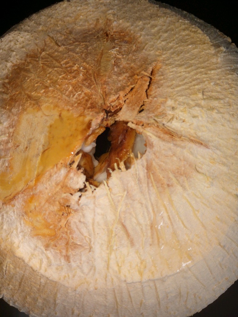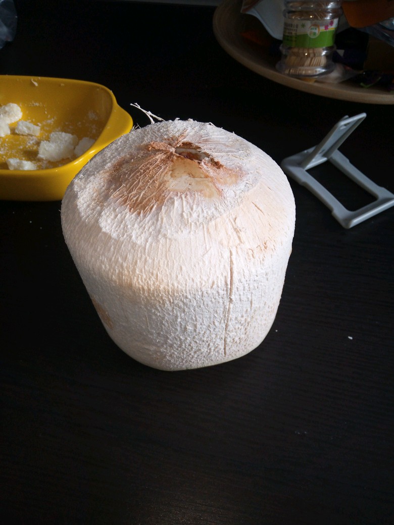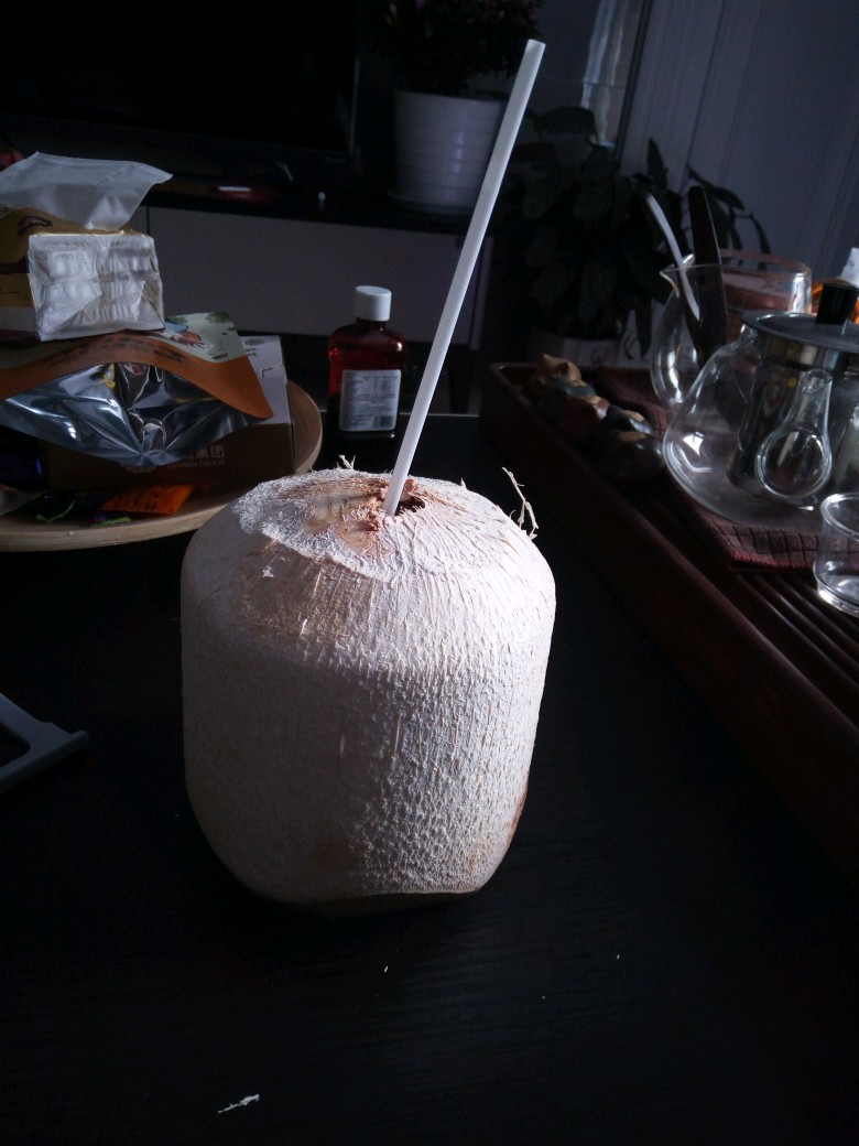 老爸给我劈开了一个海南大椰子。我正在喝它的果汁。这比超市里买的椰奶饮料好喝了👦👦😍😊