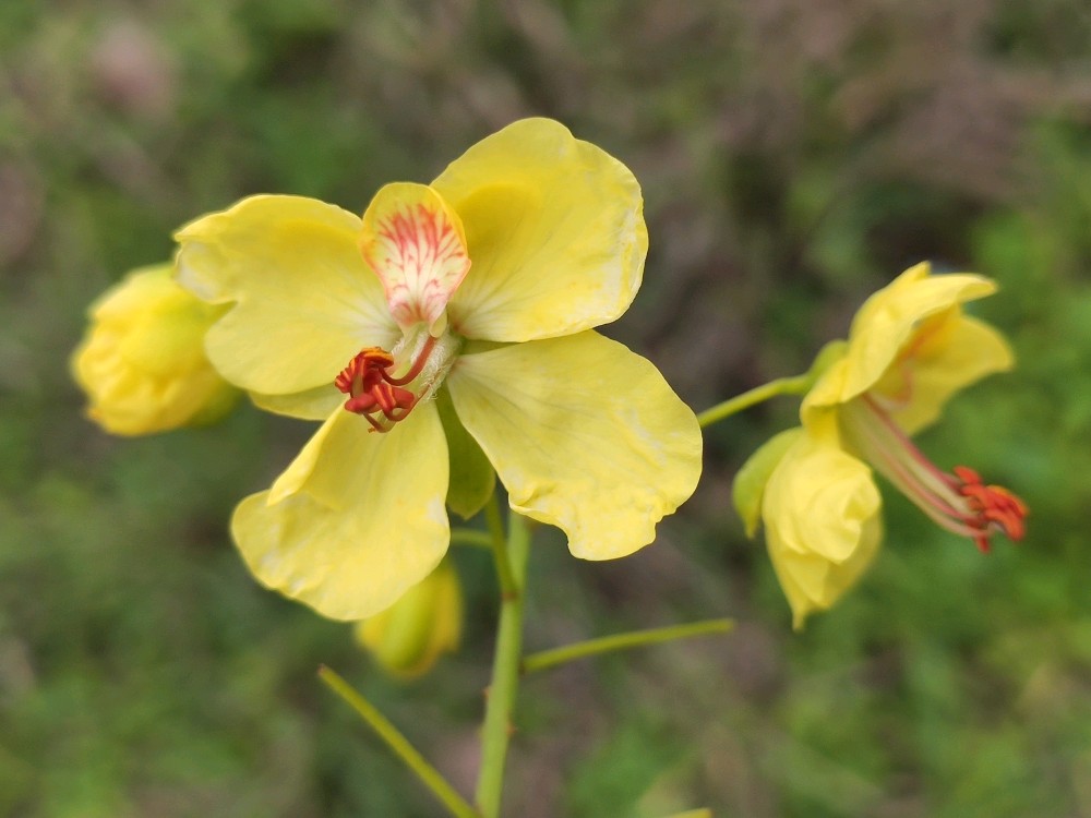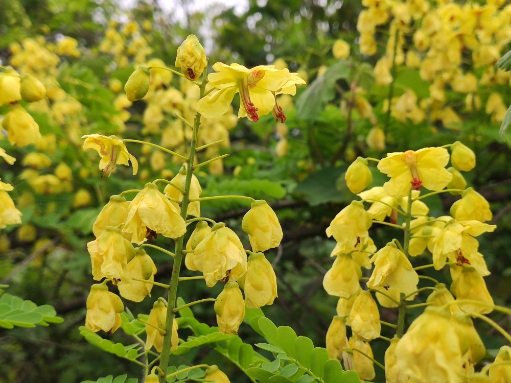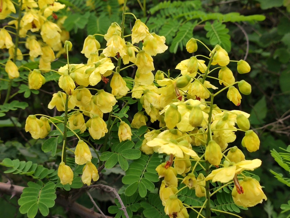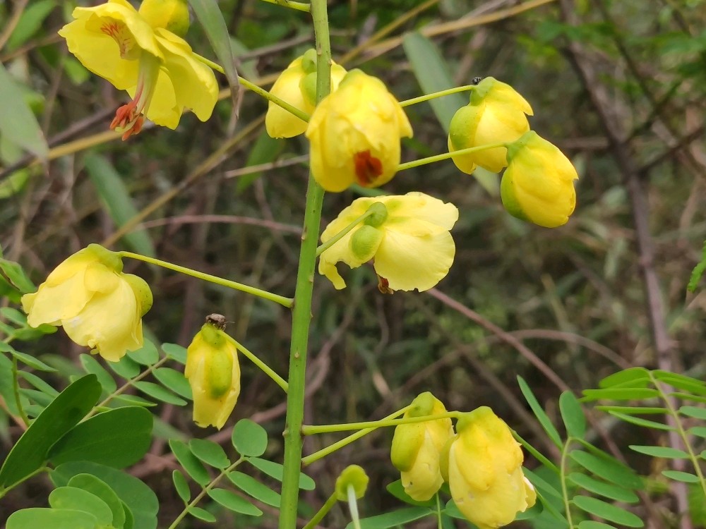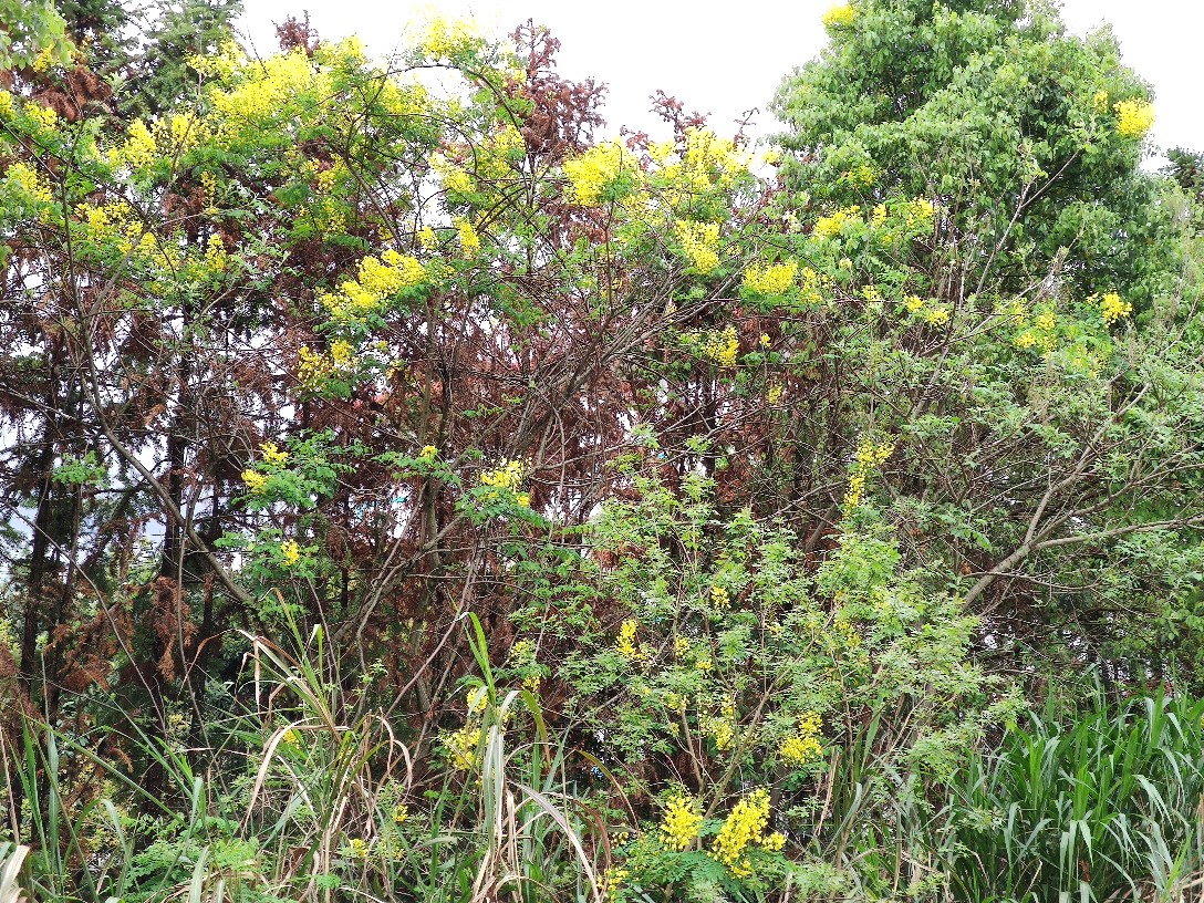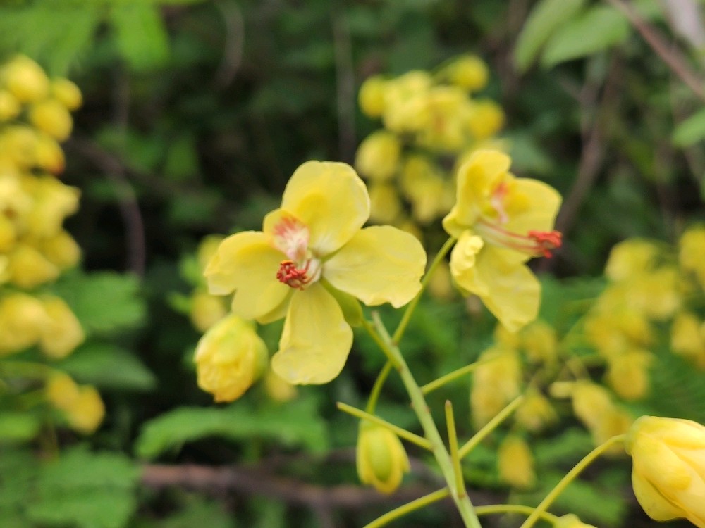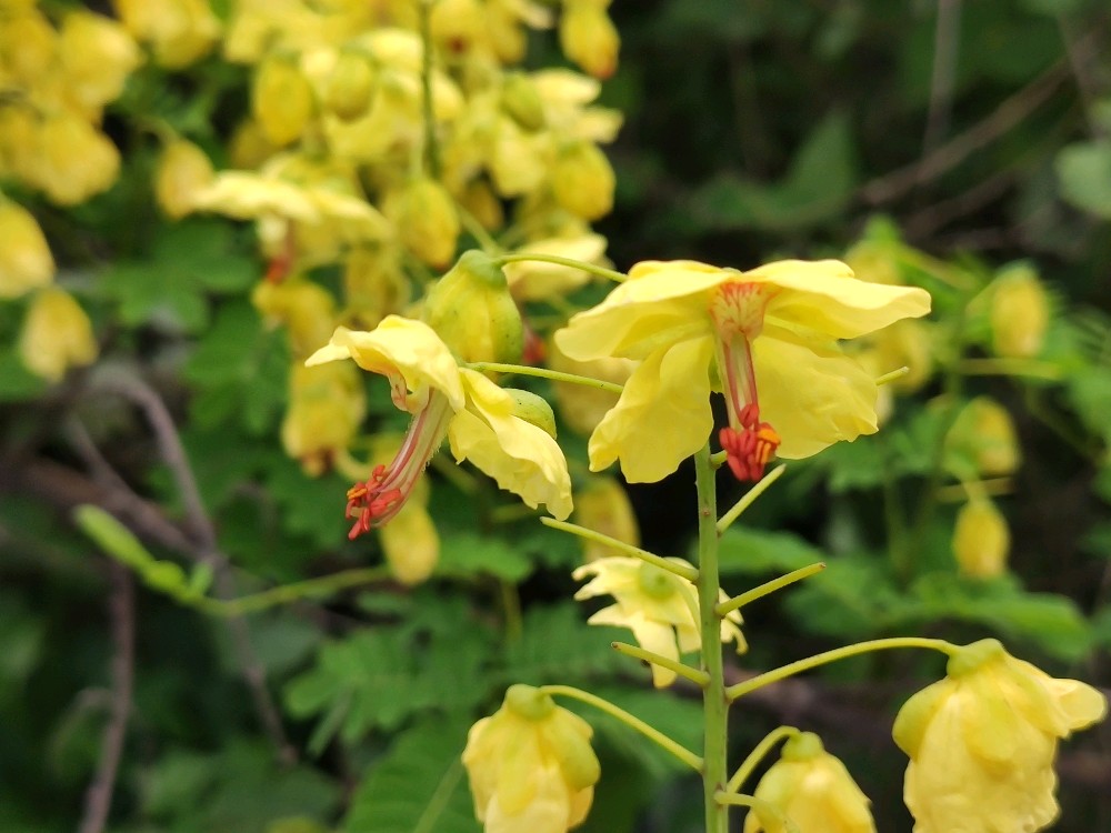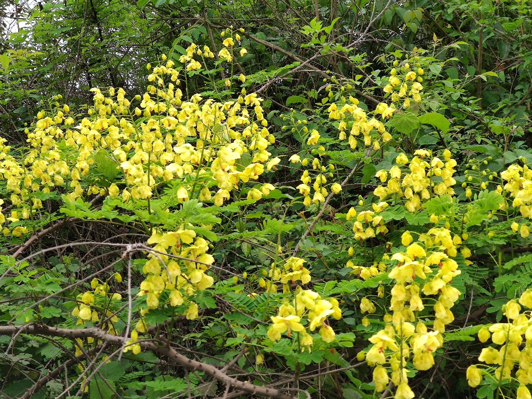 黄色的花总还是大多数的,这明艳艳的黄再加上这铺天盖地的气势,着实让人挪不开眼。它的枝干上有刺让云实有着带着防备的美,所以云实还有着“阎王刺根”的称呼。可花茎上却没有,小时候总喜欢采了玩,等到它结了果子,豆荚似的果荚里全是黏糊糊的液体,我们总拿了它当胶水使