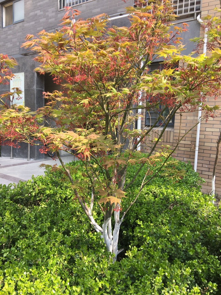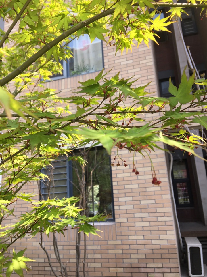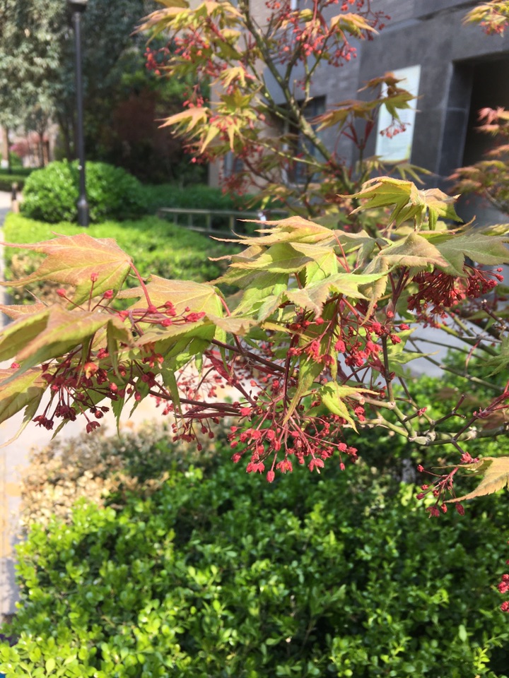 多少年来,我一直以为槭树是一种观叶的树种,只看它的叶子就够养眼了。红的热烈,绿的清翠,彩的雅致……今天,在这柳絮刚开始飘飞的时候,有的槭树也在开花,红色的小花一簇簇垂于叶下,更显妩媚。