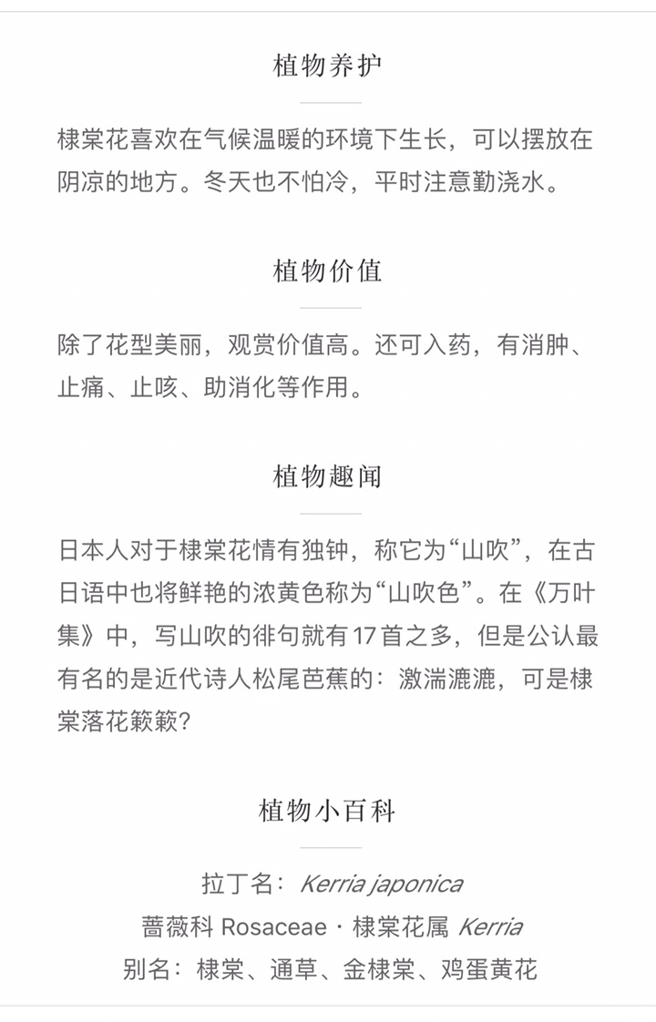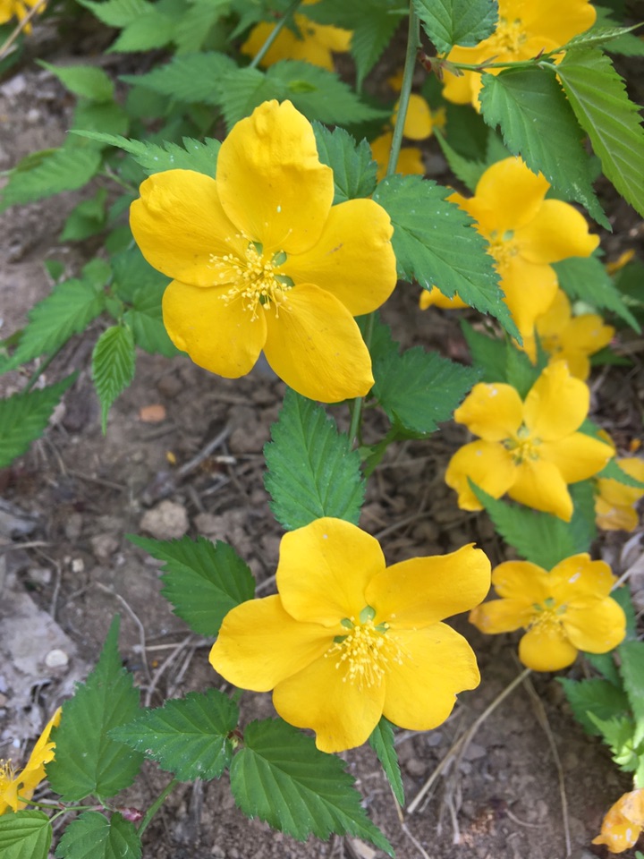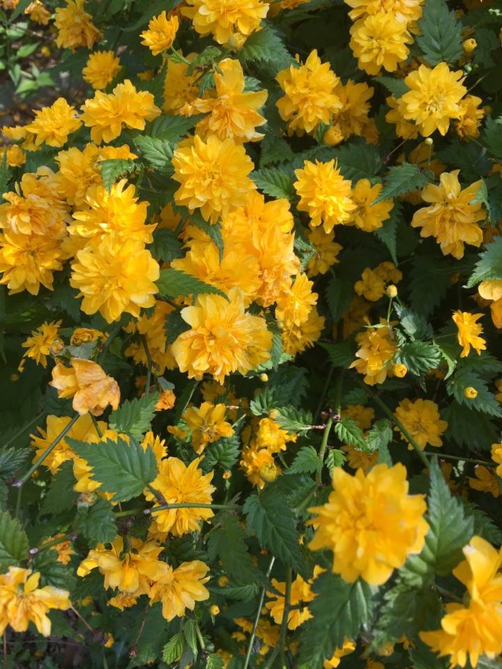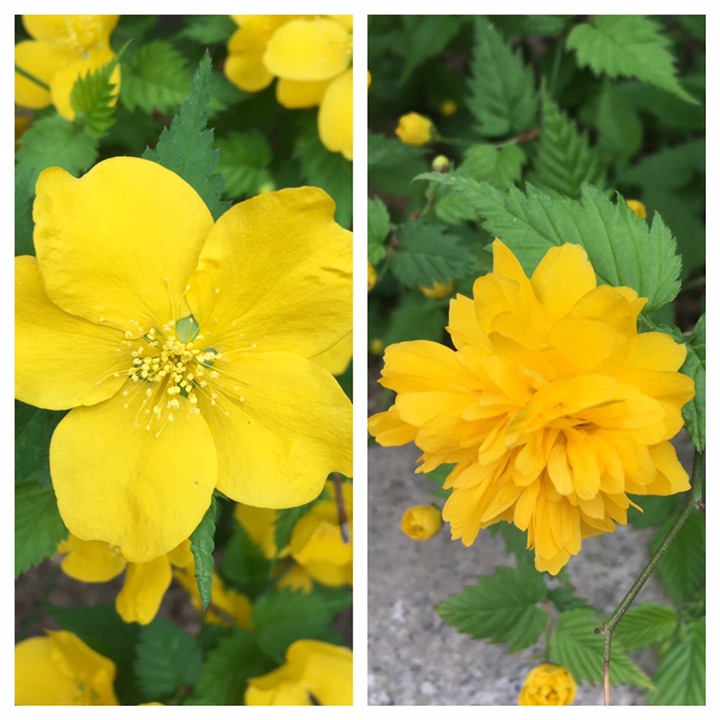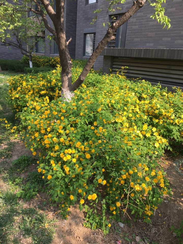棣棠花也是一种黄花。不管是单瓣还是重瓣的,都开得非常稠密,个头也比迎春花、连翘花大好几倍。远远望去一片金黄,明亮耀眼。