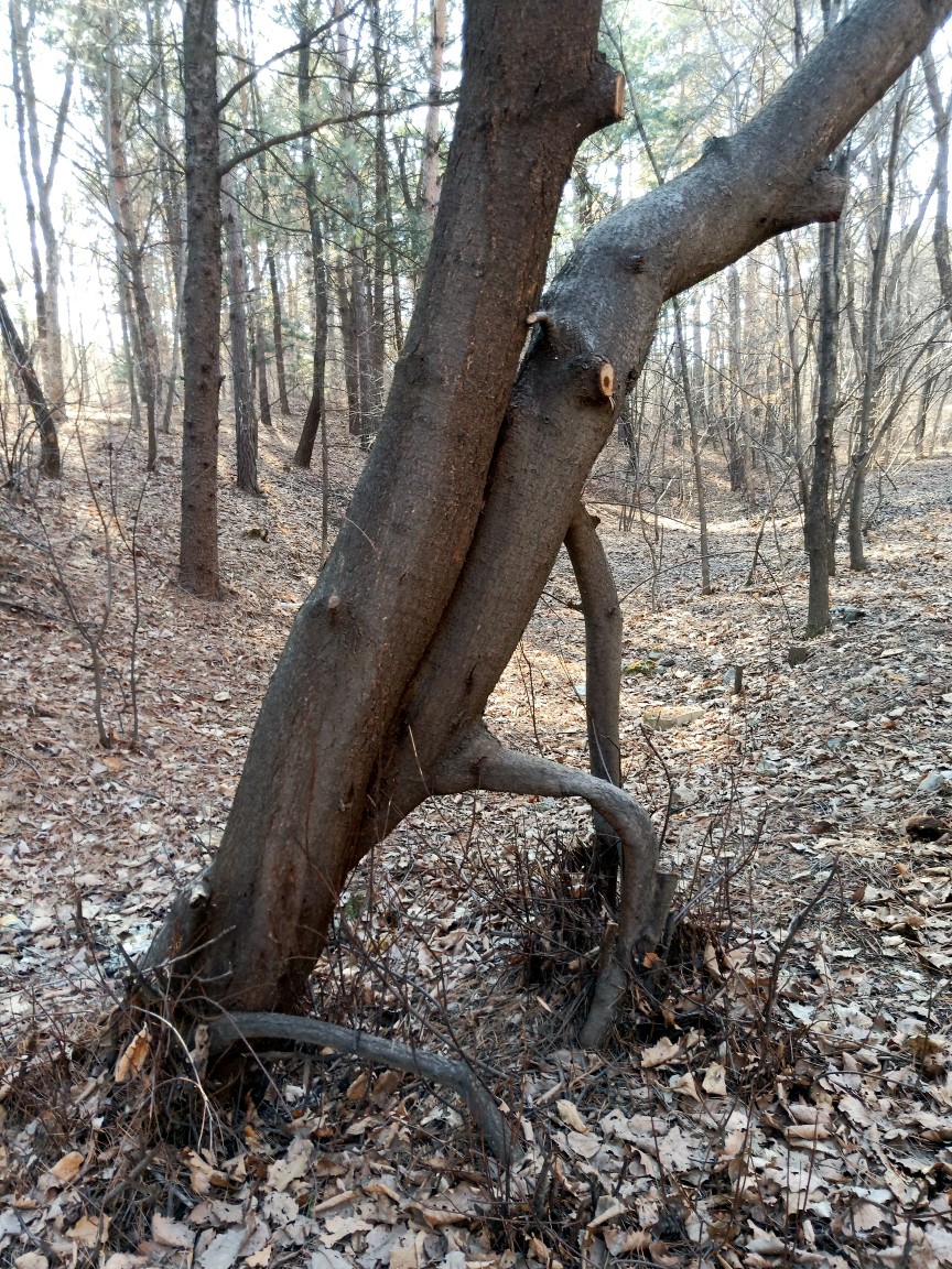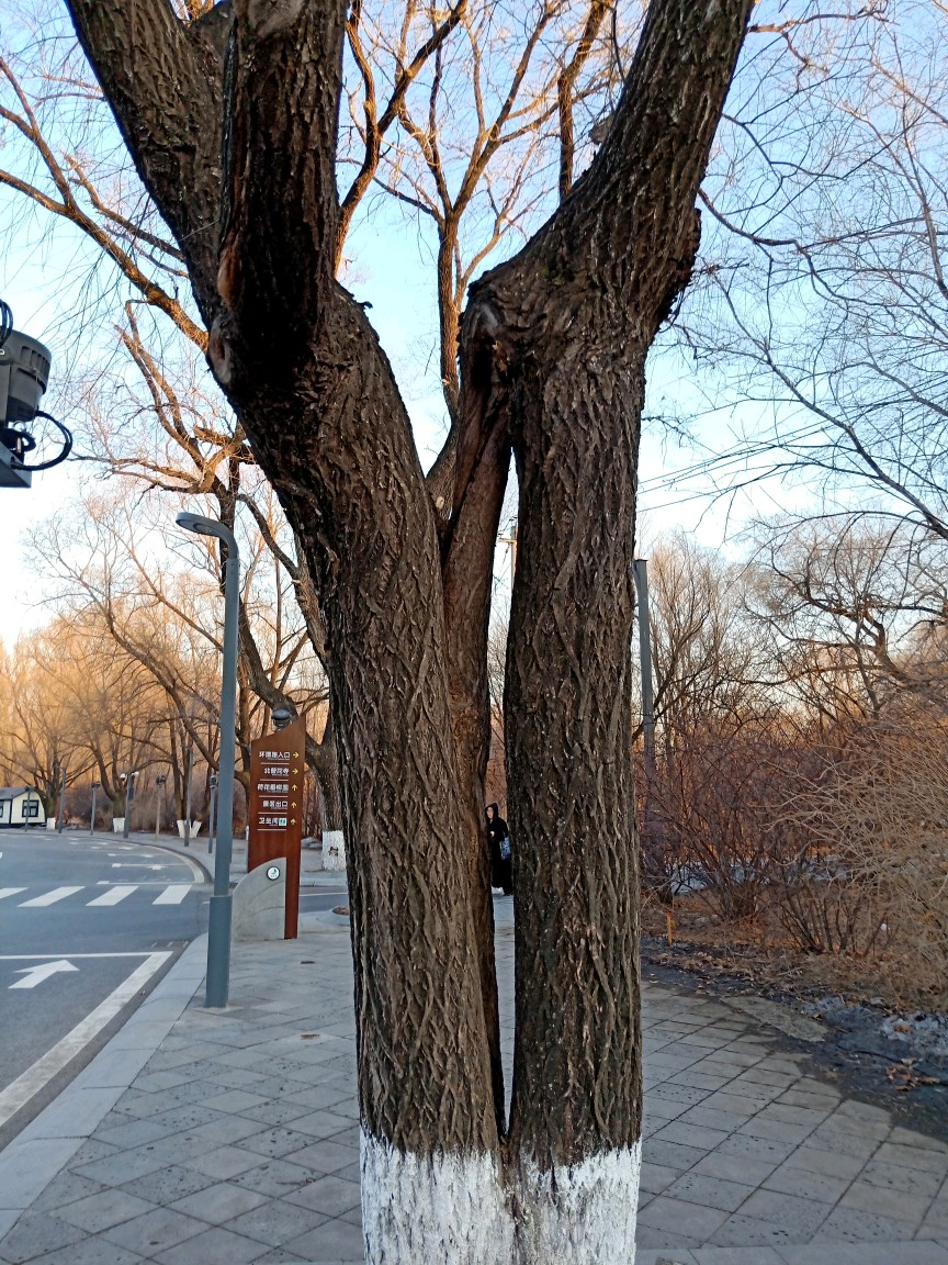 其实这还是一棵树呢,这棵树分叉完了以后又长出连理枝,让两个树干又连一块儿了。