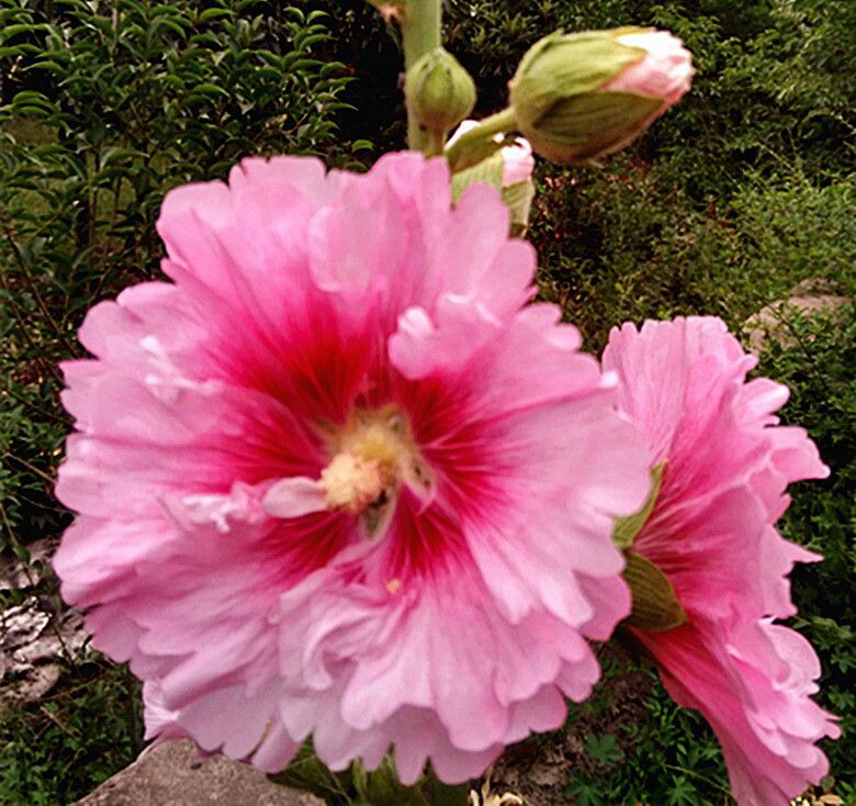 单位院里路旁的野生蜀葵,两簇,一路边粉,另一路边红。