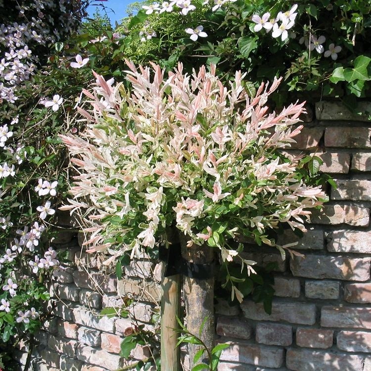 荷兰彩叶杞柳,新叶先端粉白色,基部黄绿色密布白色斑点,随着时间推移,叶色转变为黄绿色带粉红白色斑点。 枝条柔软、舒展、呈放射状,随风飘摆,令人迷醉,观赏价值极高,可广泛应用于绿篱、河道及公路、铁路两侧的绿化美化,可高接于其它柳树作为行道树的栽培,可片植或用于公园、植物园的成片种植,景观效果非常优美,也适合盆栽观赏