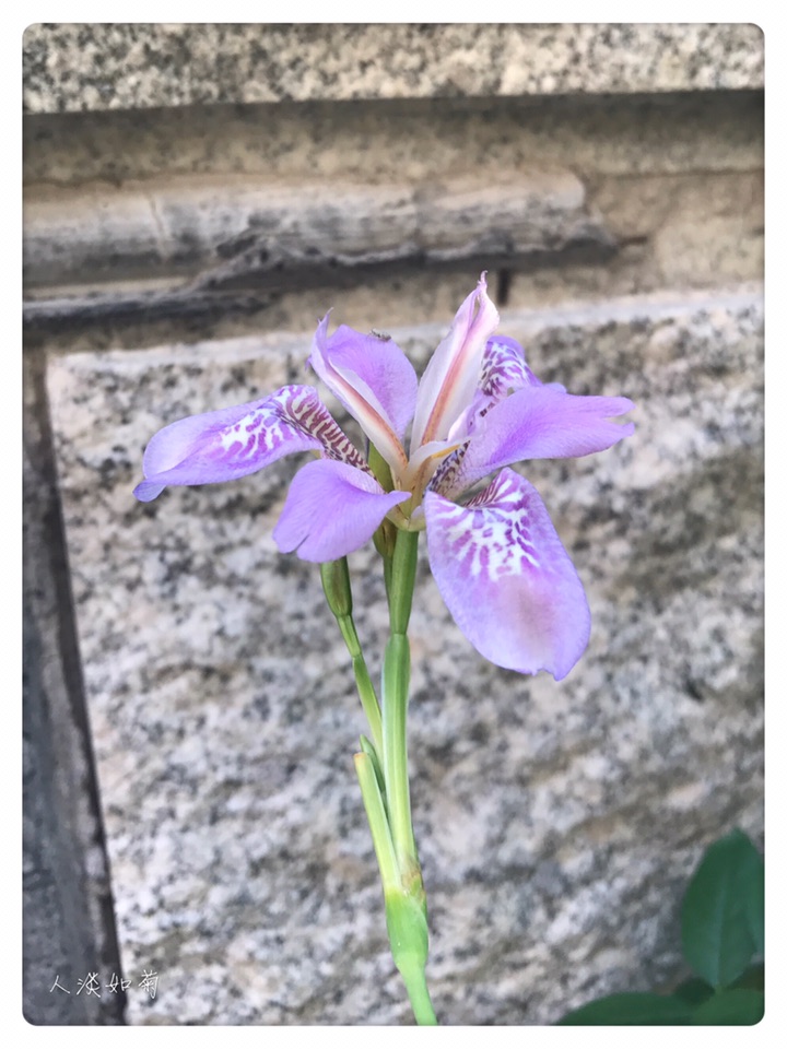 野鸢尾,花蓝紫色或浅蓝色,有棕褐色的斑纹,外花被裂片宽倒披针形,上部向外反折,内花被裂片狭倒卵形,顶端微凹。花柱分枝花瓣状。