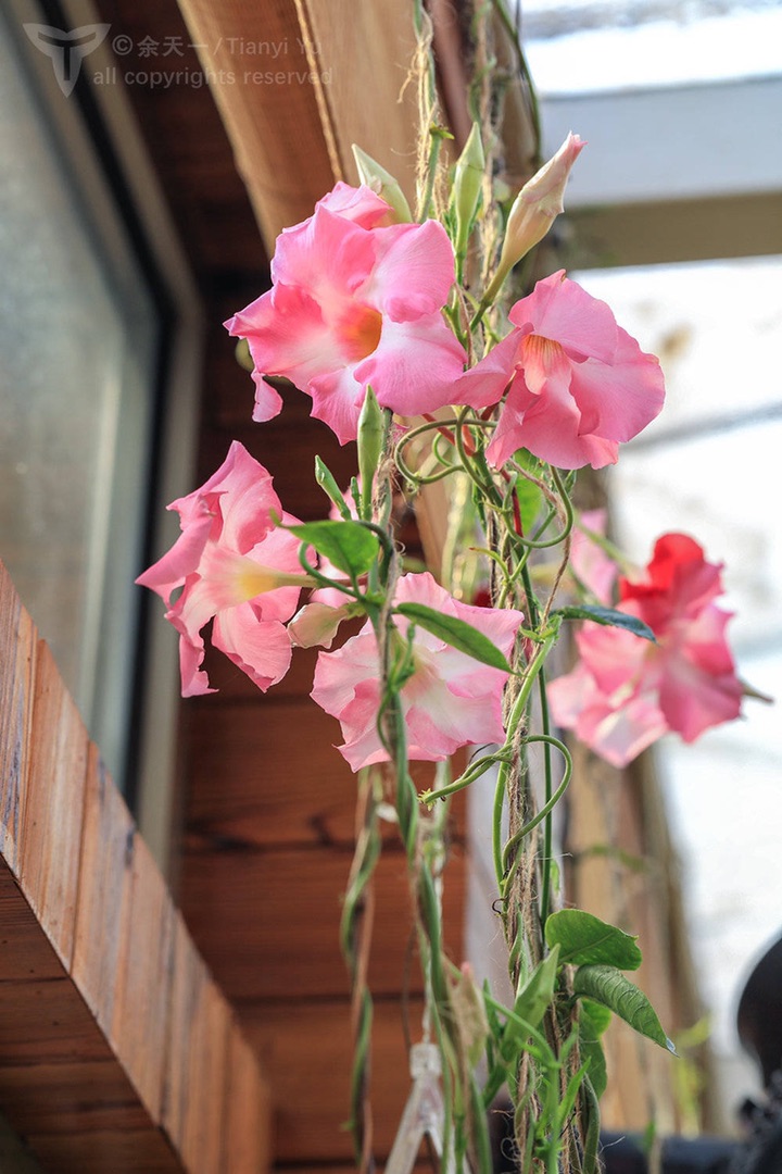 是夹竹桃科,双腺藤属多年生常绿藤本植物。叶全缘对生,叶片长卵圆形,革质,叶面有皱摺,叶色富有光泽,花腋生,花冠漏斗形,[1][2]花为红色、桃红色、粉红色等。初春到深秋几乎全年花开。原产美洲热带。喜充足的阳光,喜欢温暖湿润的环境,不耐寒,对土壤的要求不是很高,以肥沃疏松排水性良好的沙质土壤为佳。