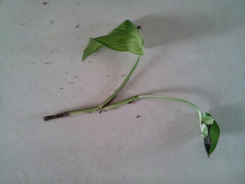 没有长出根而直接插到土里会如同掉到了土上的叶子一样直接腐烂的,我在种多肉的时候遇到过这种情况的。比如种花时把土盖的太多而淹没过没长出根的茎就会使茎变的和图片一样的。你先把绿萝的下端在水里泡一段时间泡出根再种到土里试试吧。