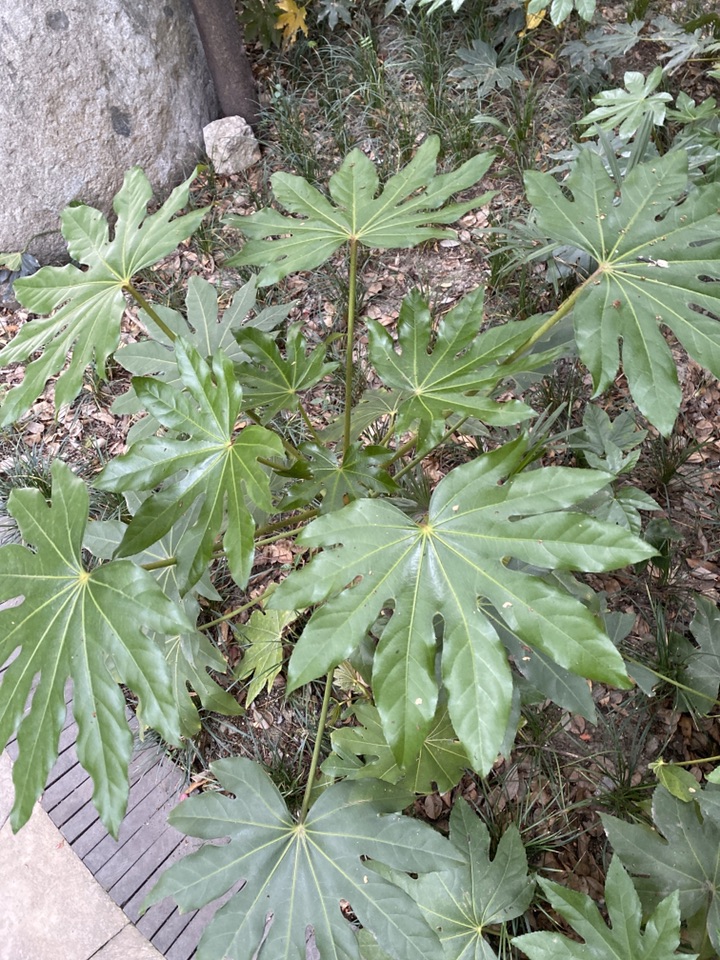 乃指其掌状的叶片,裂叶约8片,看似有8个角而名。它叶丛四季油光青翠,叶片象一只只绿色的手掌。其性耐荫,在园林中常种植于假山边上或大树旁边,还能作为观叶植物用于室内,厅堂及会场陈设。