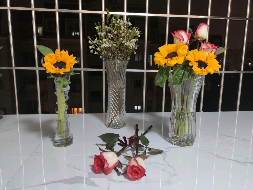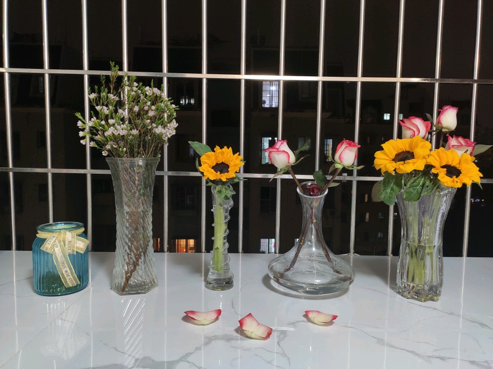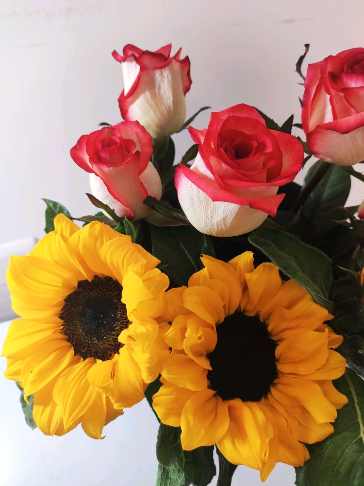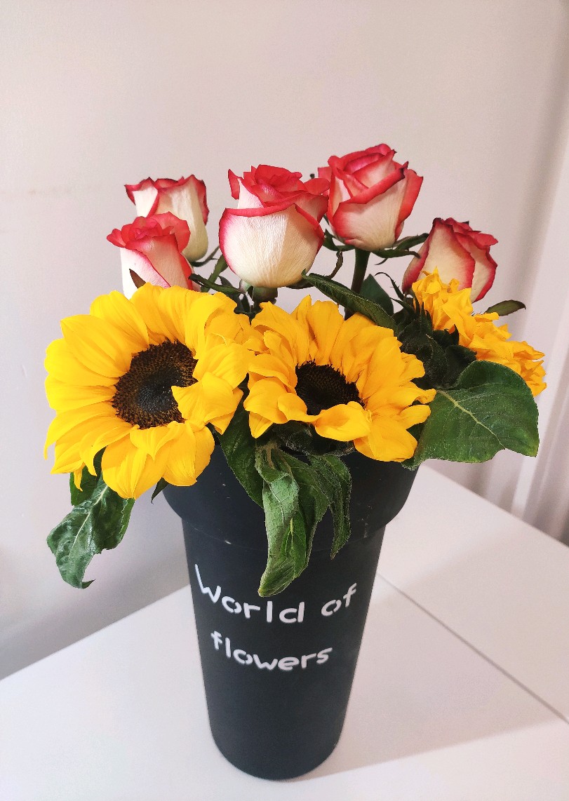有那么一个时刻,非常想拥有一捧灿烂的向日葵,能驱散所有阴霾。明艳的黄色向日葵,红白双搭的胭脂扣,清雅素静的白色腊梅,某天聚在一起。