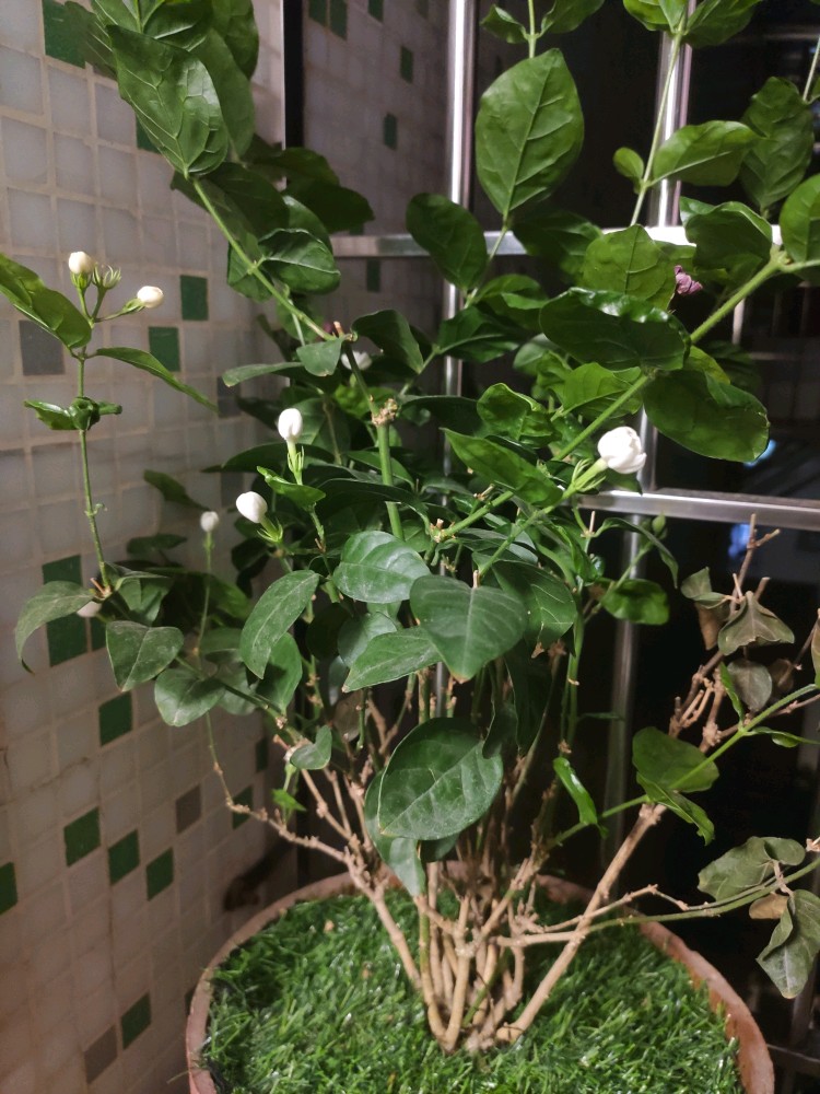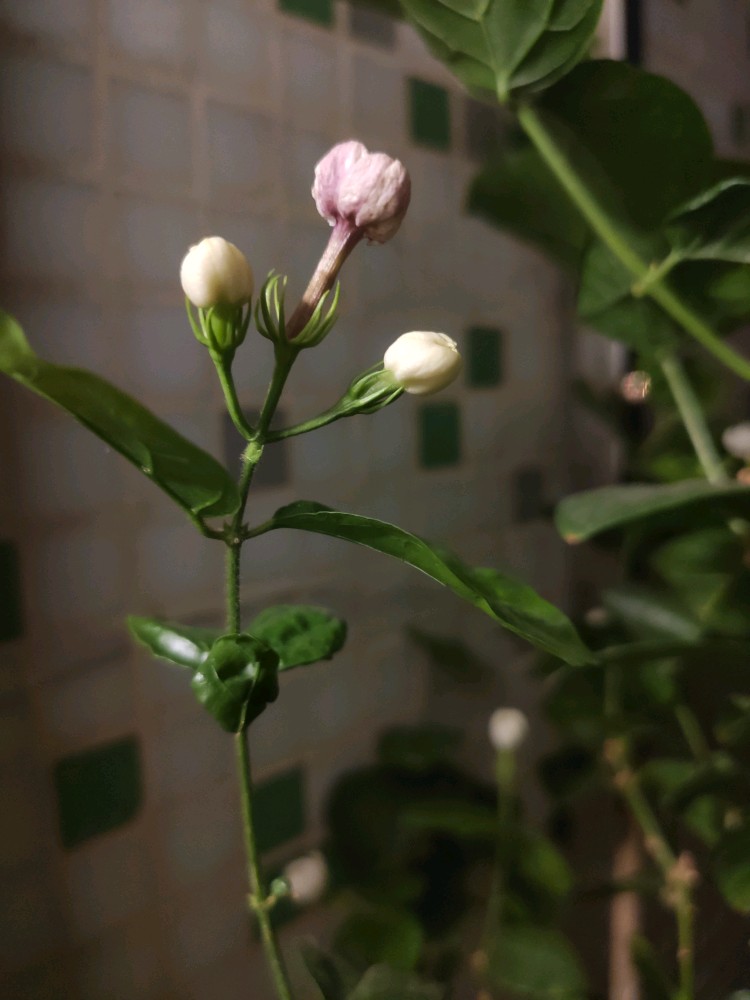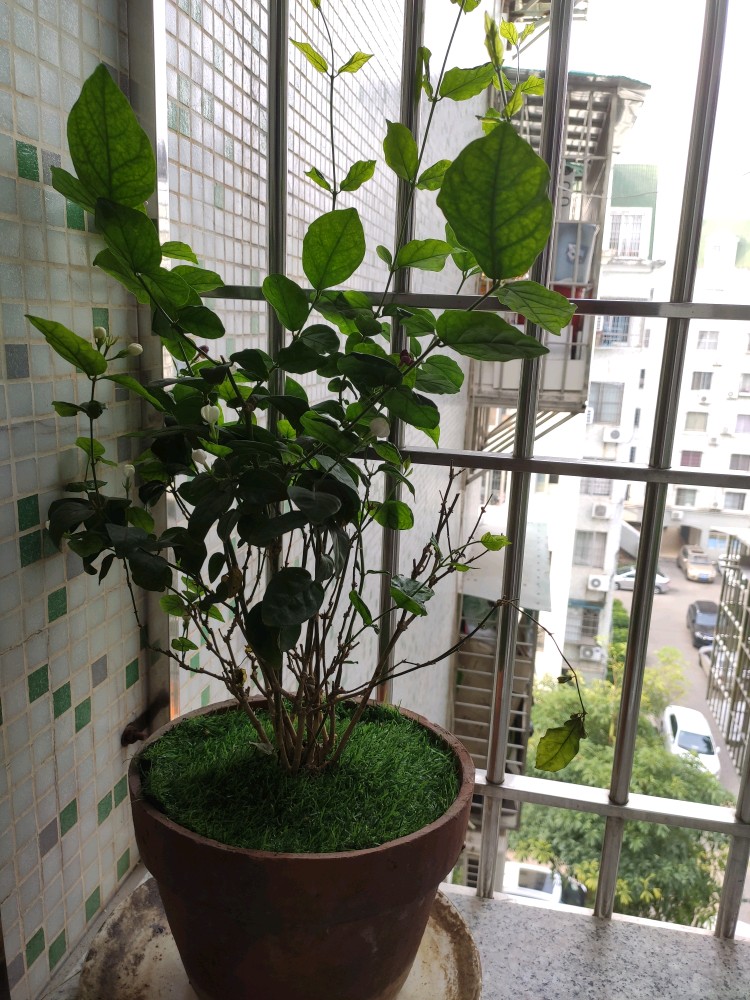 窗台有一盆茉莉花,嫩嫩的绿叶,带着星星点点的白色花苞,枝桠向着阳光高高伸展。