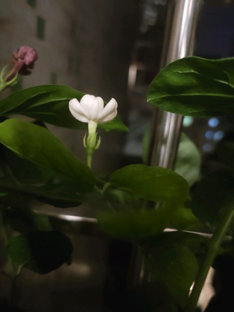 就这么几天花苞儿陆续开放,花朵不大,小小地团着,带着清清的幽香。花谢了,花团渐变成浅紫色,深紫色,再渐渐凋落,和之前养的重瓣茉莉不一样。重瓣华丽浓郁,这个品种清幽,残花会变色更让人怜惜,都好都美。