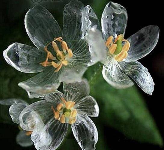 日本本州岛北部至北海道的深山地区,存在着淋雨后花朵会透明化的植物,数量稀少,据说特别好的运气才能看到透明的那瞬间,叫山荷叶。这主要是因为水分容易侵入花瓣内的细胞间隙,由于水和细胞液折射率接近,消除了反射界面,透射部分增强,花瓣就显得透明了。